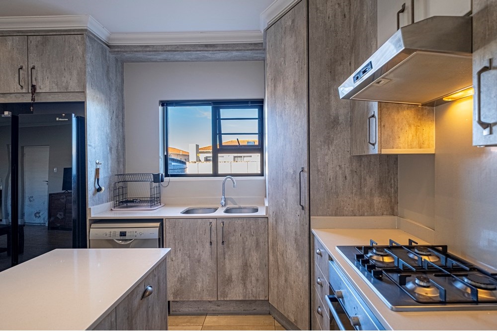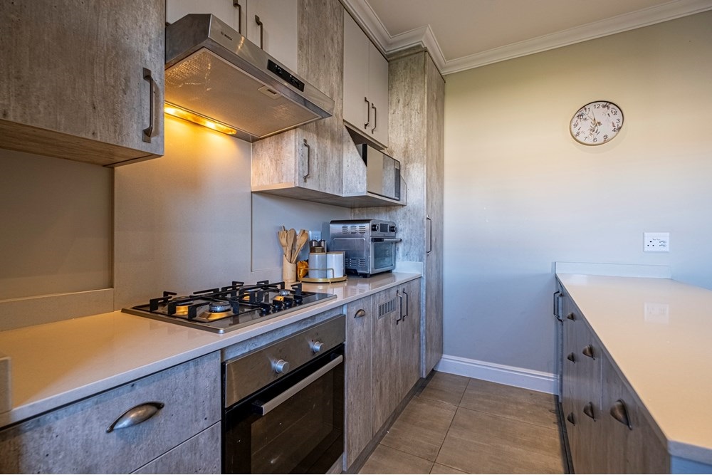 The kitchen boasts ample cupboard space, sleek Caesarstone countertops, a gas hob, and an undercounter electric oven, ideal for home chefs who love to entertain.