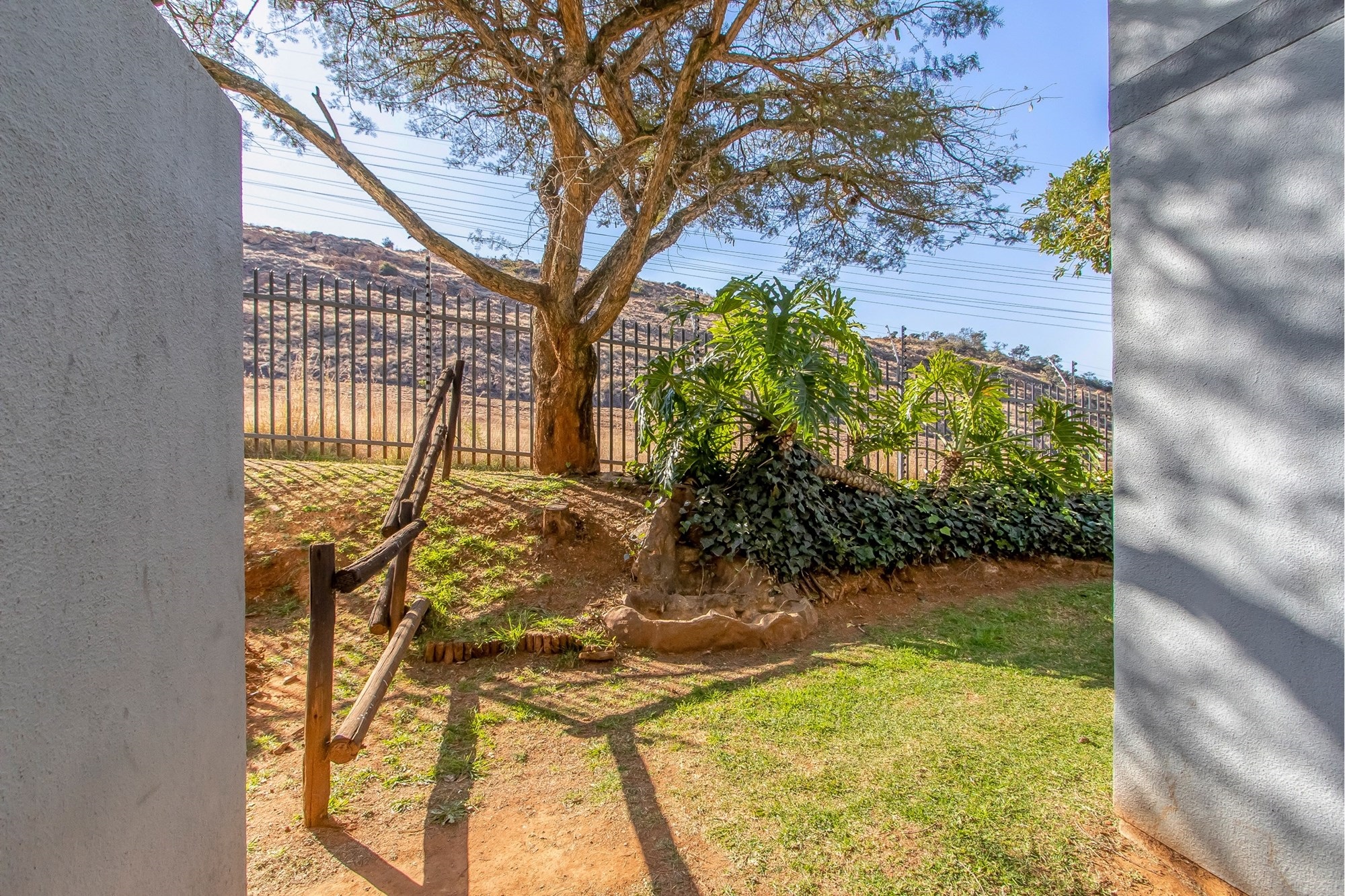Step into a bright and airy open-plan living area that flows onto a paved patio, providing an ideal spot to unwind, entertain, or soak in the peaceful views of the koppies. The kitchen is neatly designed with practical finishes and offers built-in stove and oven, tiled flooring, ample upper and lower cabinetry, space for a slimline fridge and undercounter plumbing for a washing machine.
