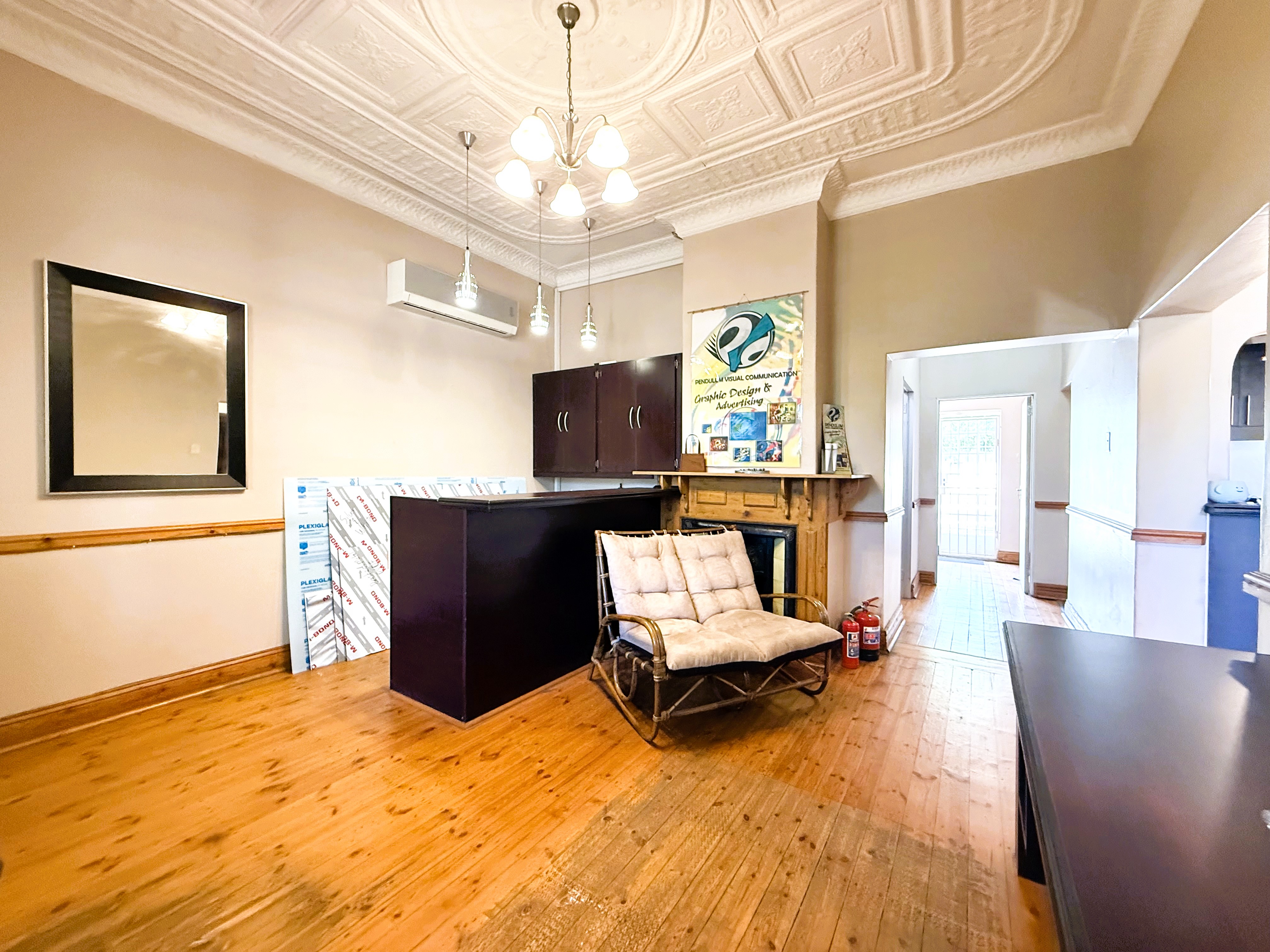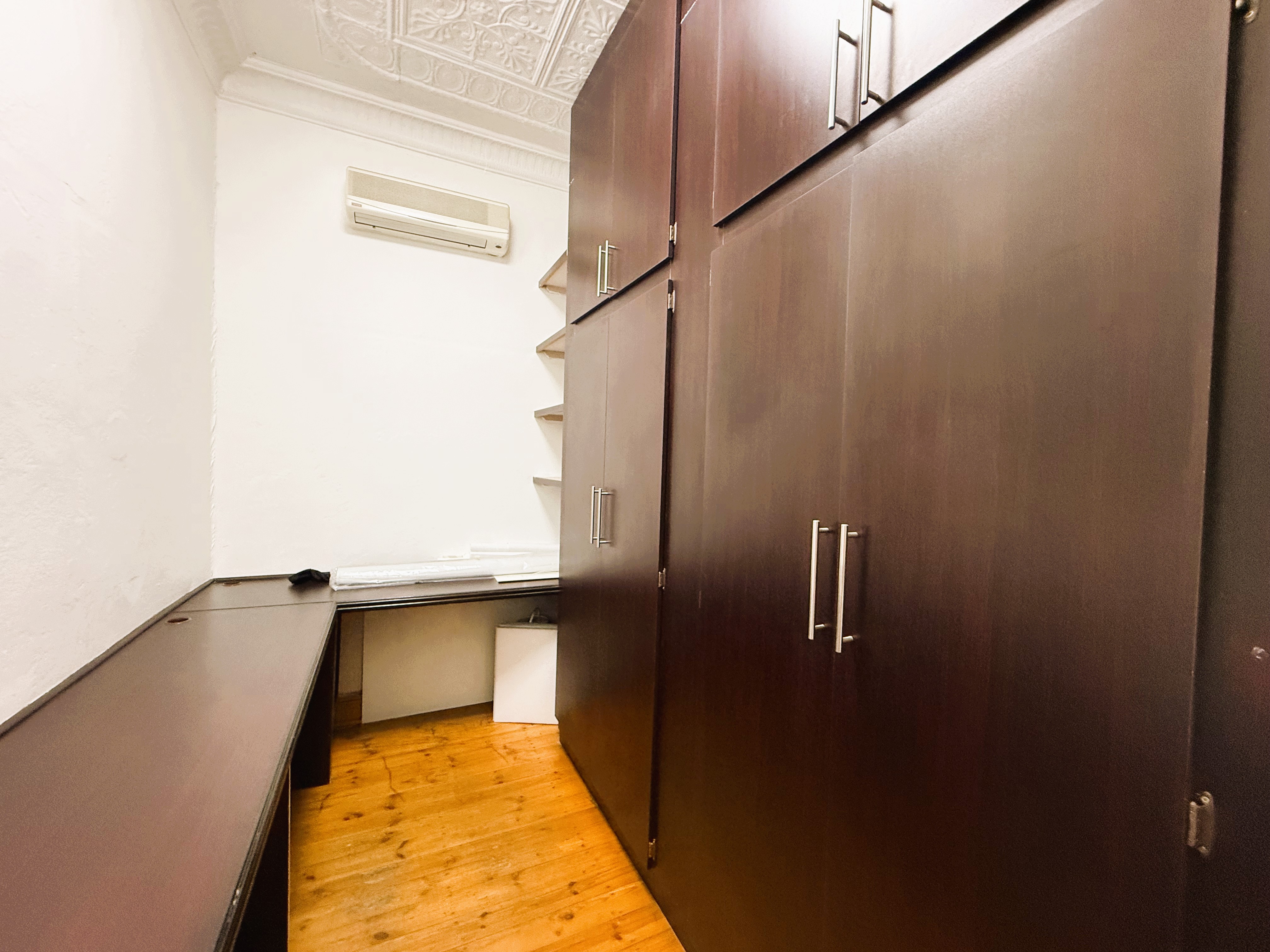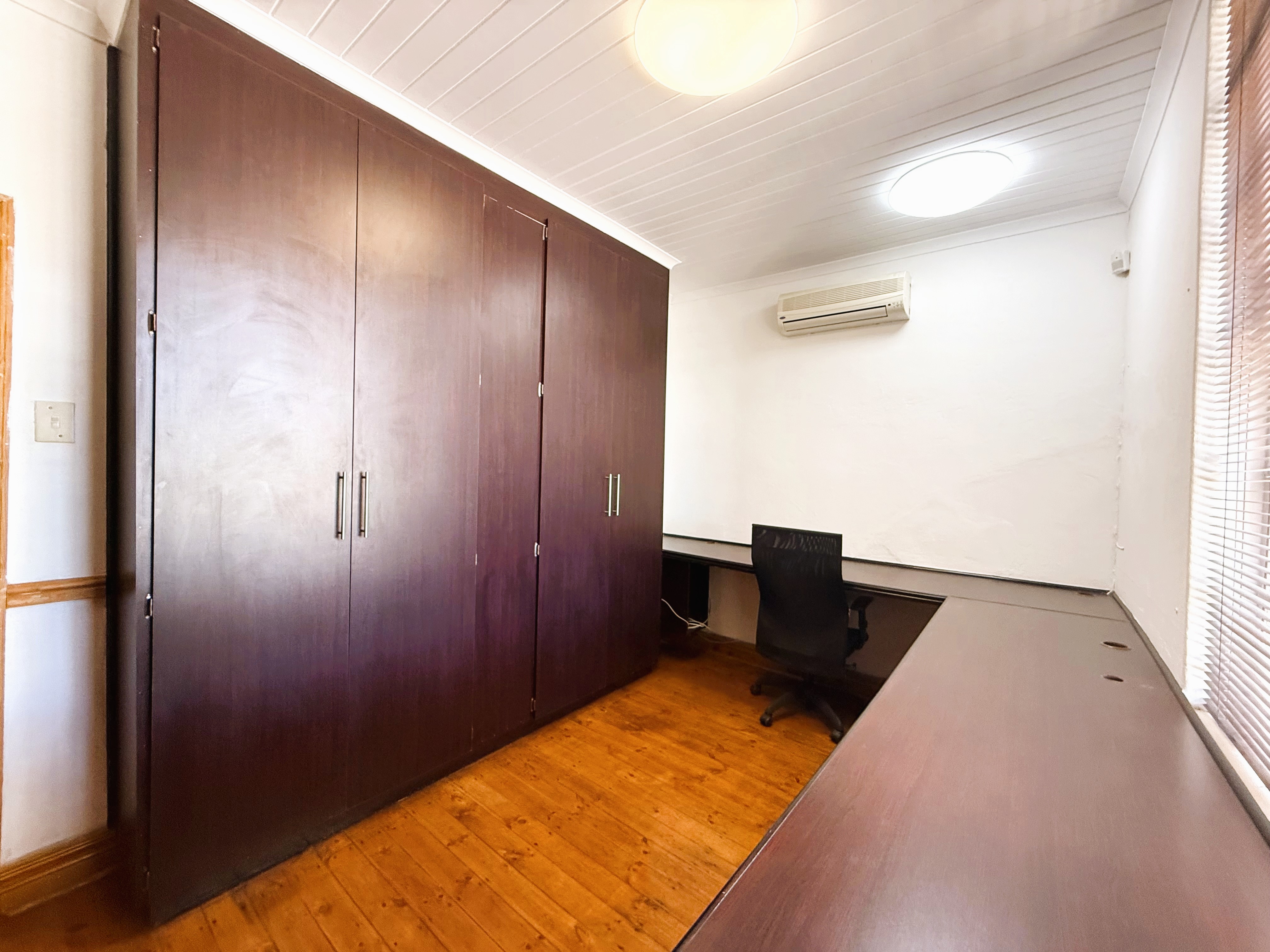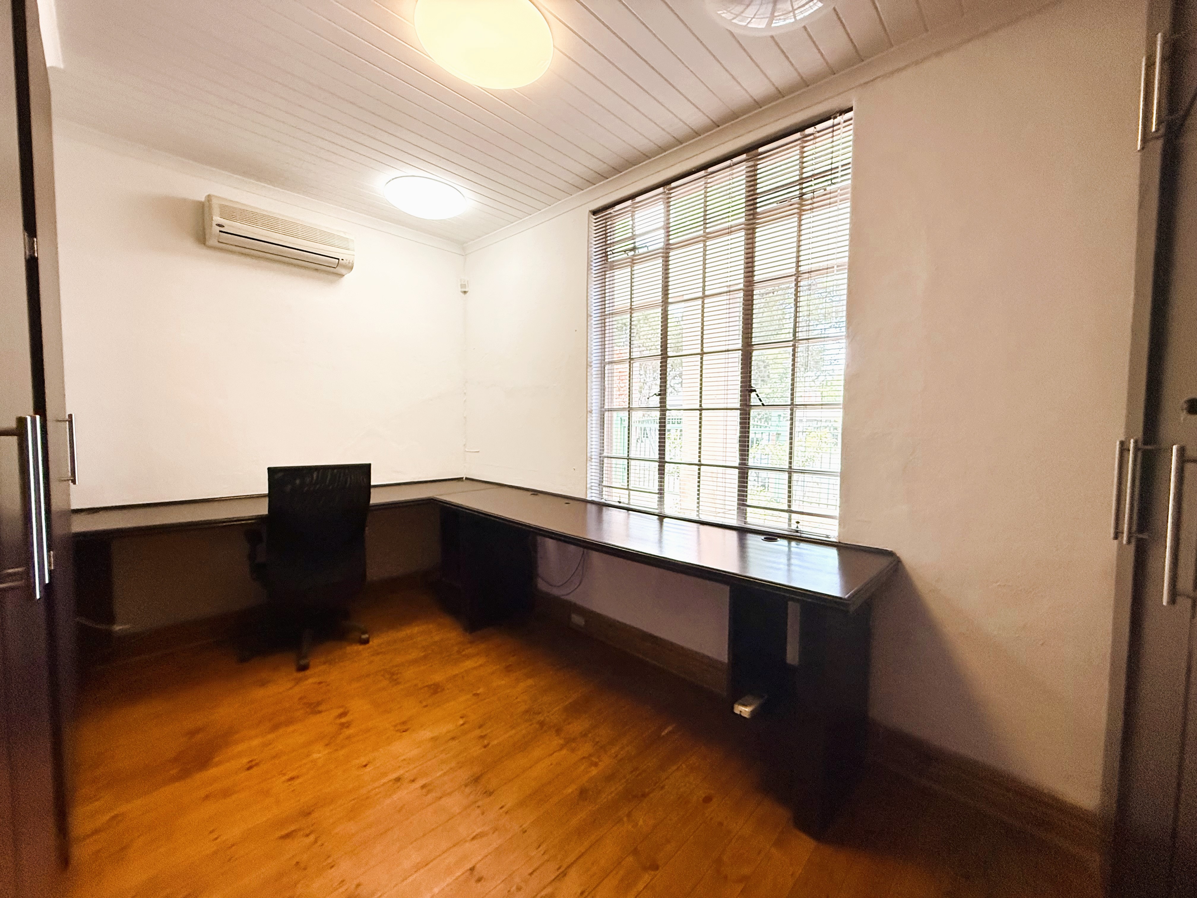 The building exudes classic charm with practical functionality, featuring beautiful ceilings and thoughtfully designed spaces throughout. The current layout includes built-in workstations for added convenience; however, should you prefer an open canvas, these can be removed effortlessly without causing any damage to the floors or walls. Each office is equipped with built-in cupboards and air conditioners, ensuring comfort, organisation, and an efficient workflow.