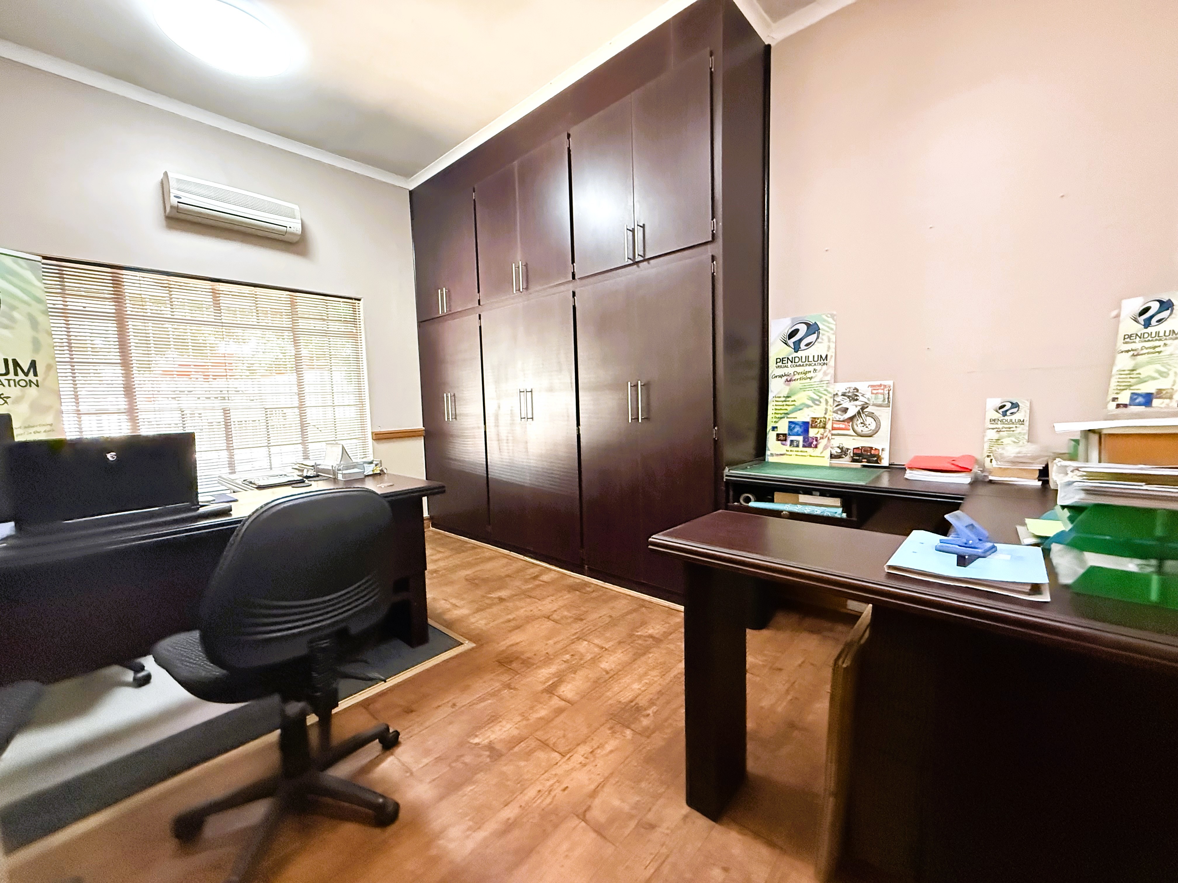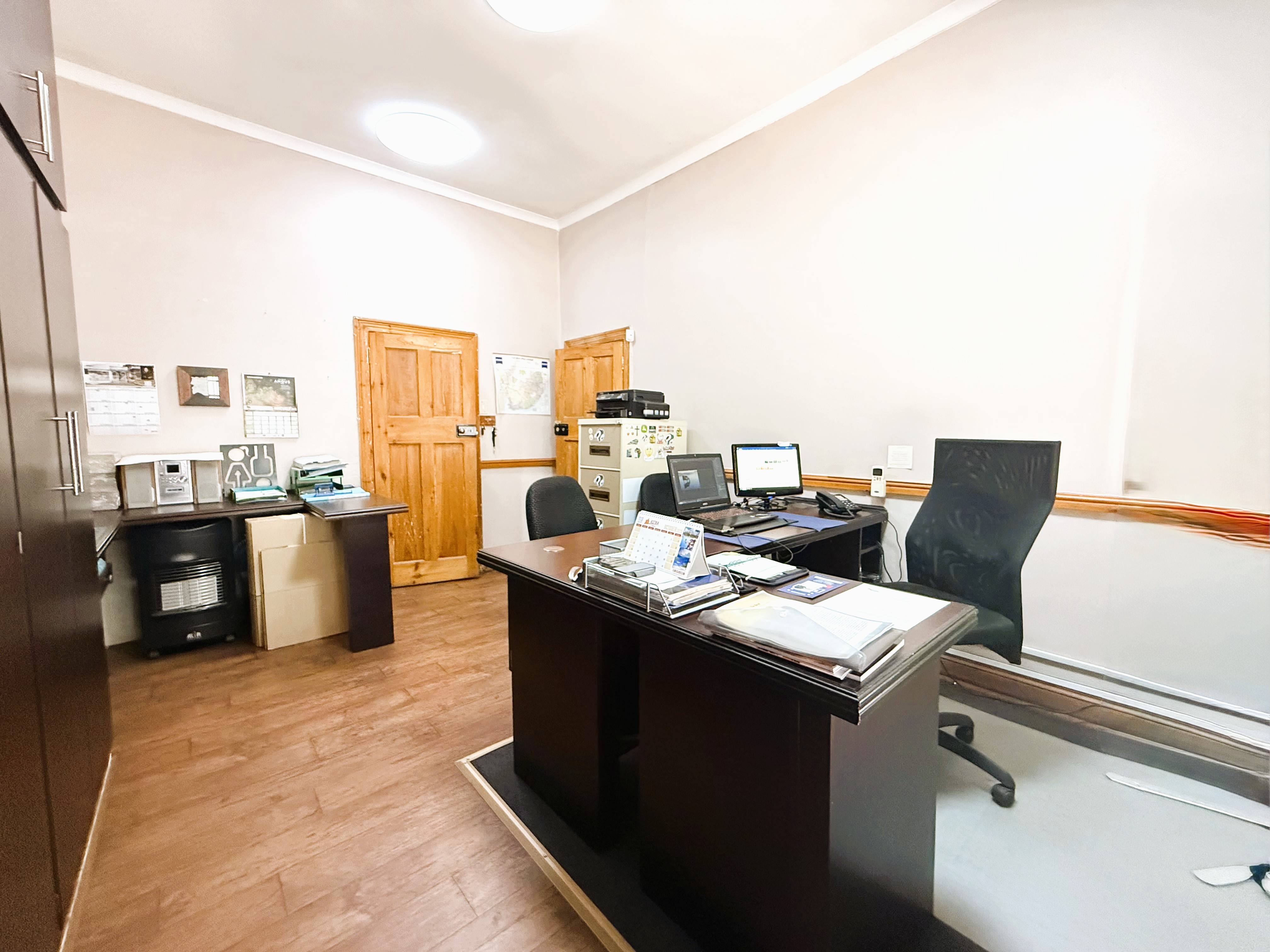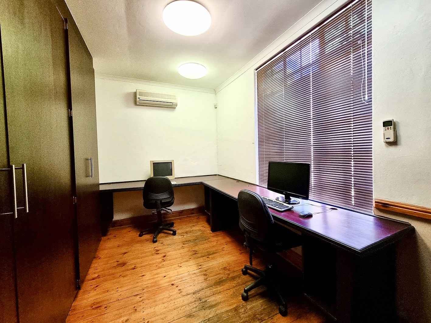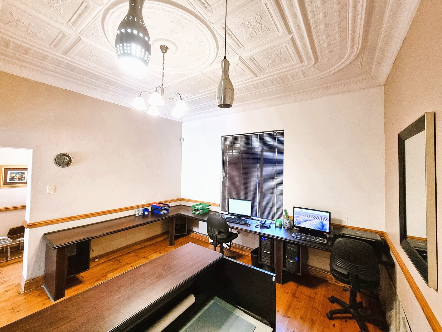 The building exudes classic charm with practical functionality, featuring beautiful ceilings and thoughtfully designed spaces throughout. The current layout includes built-in workstations for added convenience; however, should you prefer an open canvas, these can be removed effortlessly without causing any damage to the floors or walls. Each office is equipped with built-in cupboards and air conditioners, ensuring comfort, organisation, and an efficient workflow.