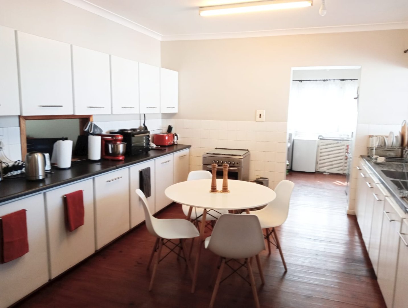 Fully fitted kitchen with built-in cupboards and stove