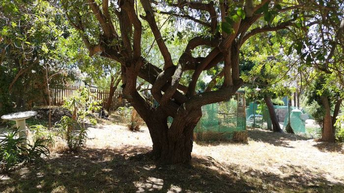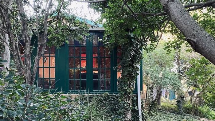 Heritage cottage beneath mature trees in Bot River, steps from Beaumont Winery, featuring a stained-glass sunroom, vintage fireplace and expansive double stand. Two bedrooms, one bath, two covered bays.