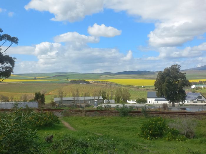 Wake up to vineyard, farmland and mountain views — even the steam train passing — in sleepy, central Botriver. Generous double-sized plot with water, electricity and dual street access.