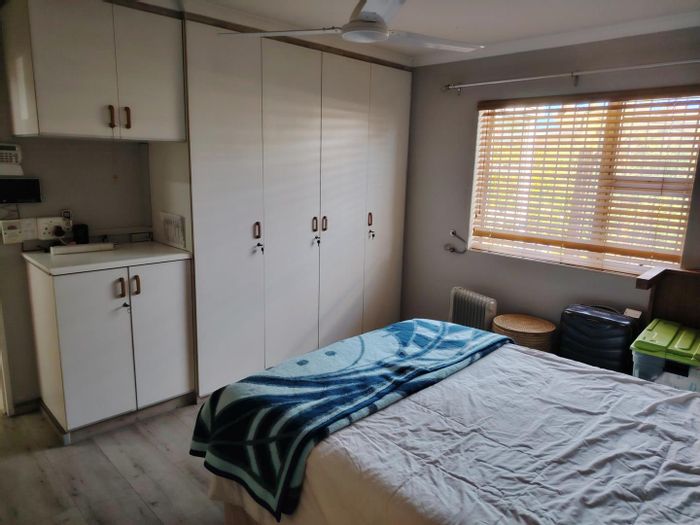 Effortless indoor-outdoor living in a quiet complex with private garden and braai area; main bedroom sunroom offers flexible space. Three bedrooms, one bathroom, single garage, plus extra parking.