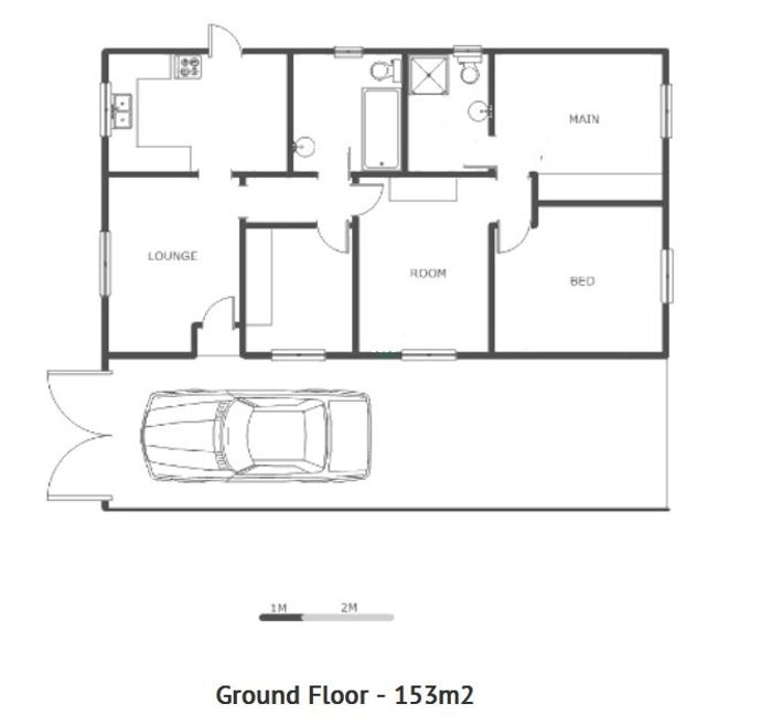 2 bedrooms, 1 bathroom, 166 m² land size. Spacious lounge, dining area, and kitchen with parking for 4 vehicles.