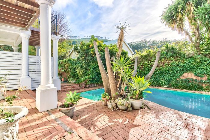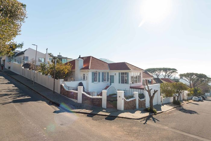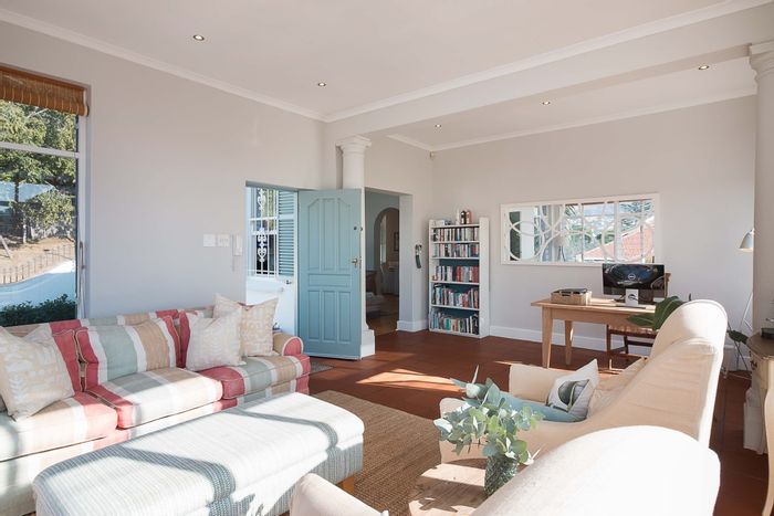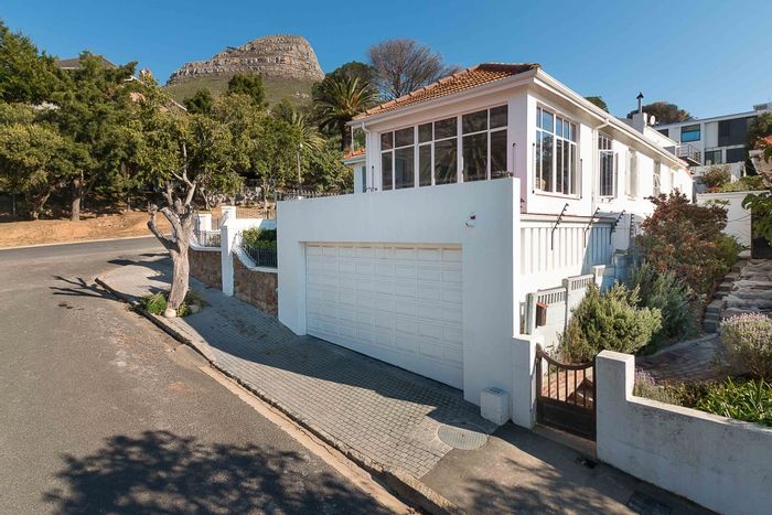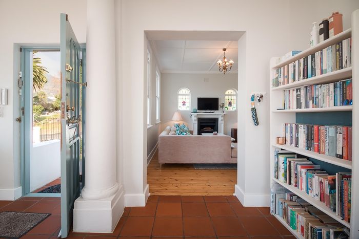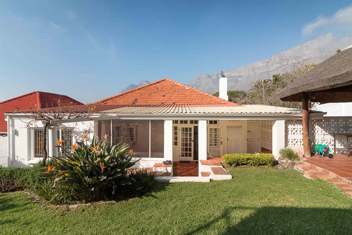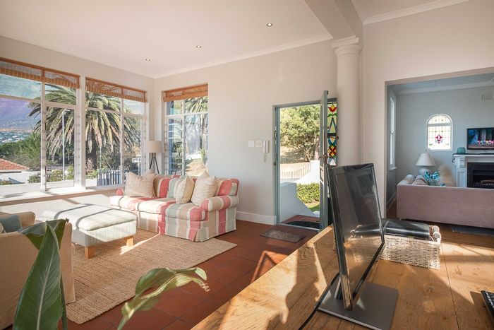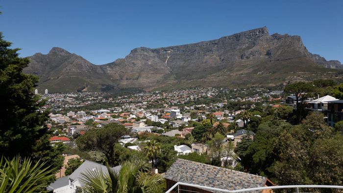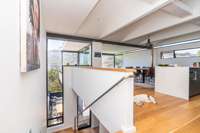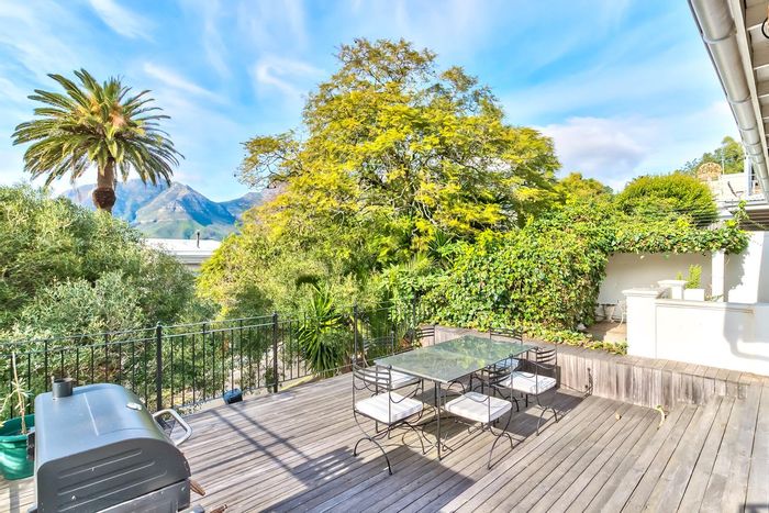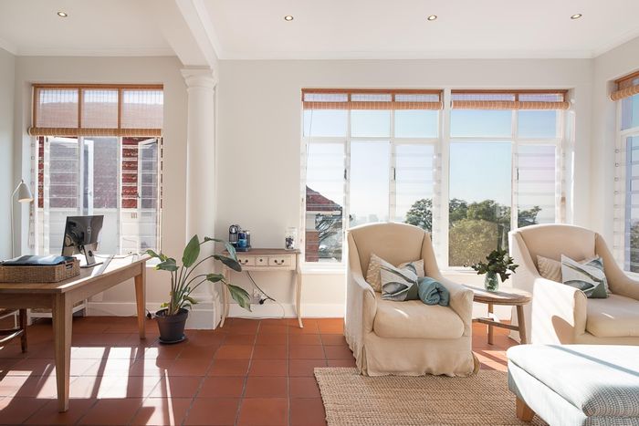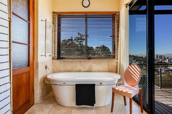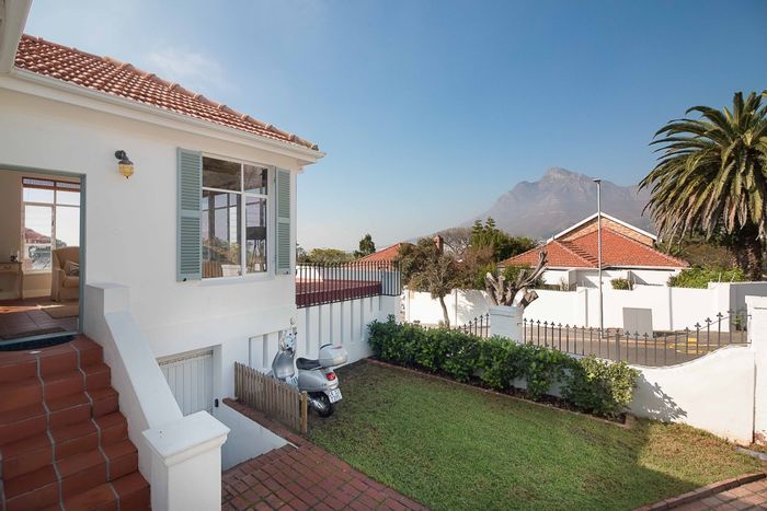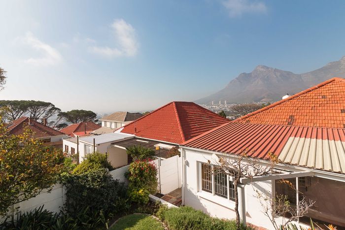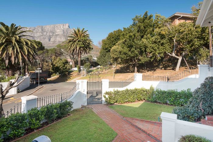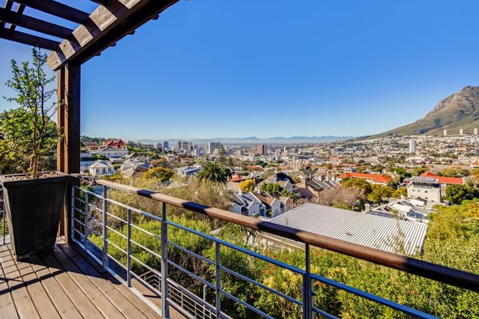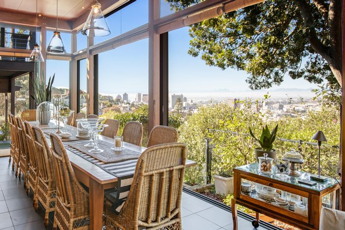 Elevated Tamboerskloof home with sweeping Table Mountain views, sun-filled gardens and thatched lapa for summer entertaining — sunroom, solid wood floors; walking distance to Kloof Street.