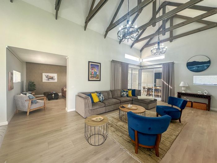 Entertainer's paradise in Earls Court Lifestyle Estate: north-facing, light-filled open-plan living with Caesarstone kitchen and fireplace, enclosed patio with built-in braai and mountain views. Four beds, three baths.
