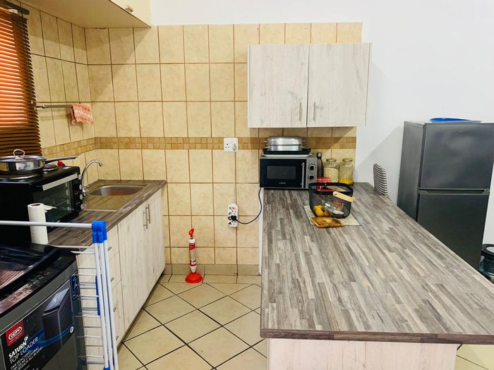 Central, secure complex living near shops, schools and bus routes — open-plan kitchen fits a double-door fridge and an enclosed braai patio; two large bedrooms, single garage and carport.