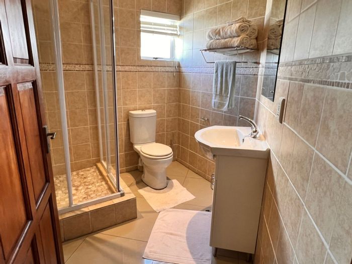 Beachside living a three-minute stroll from sand and eateries, with sunny braai area and enclosed pet-friendly garden. Upstairs main bedroom with en-suite; three beds, two baths, single garage.