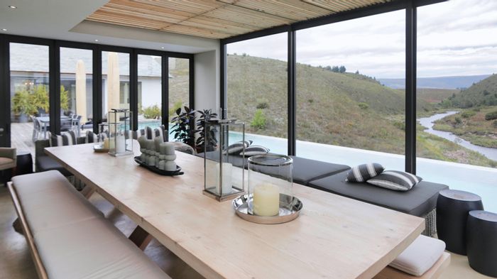 Riverfront country living in Elgin Valley amid orchards and renowned wine estates, with a manicured indigenous garden and olive grove — five en‑suite bedrooms and pool.