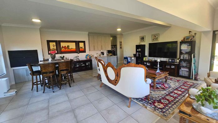 Embrace relaxed coastal living just outside Hartenbos with panoramic river, mountain and ocean views, modern island kitchen and built-in braai — three bedrooms, 2.5 baths, double garage.