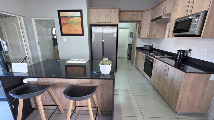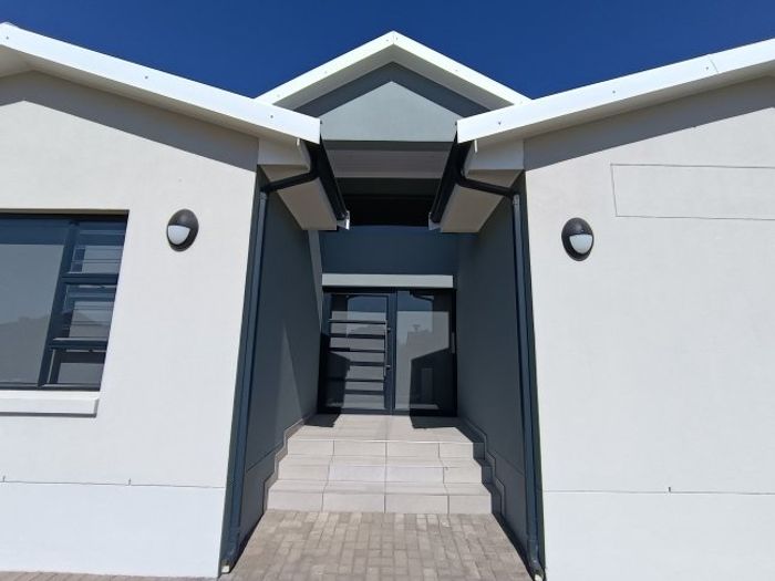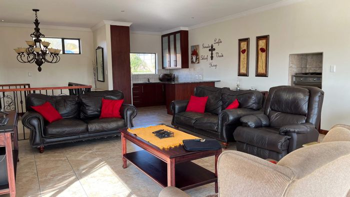 Embrace relaxed coastal living just outside Hartenbos with panoramic river, mountain and ocean views, modern island kitchen and built-in braai — three bedrooms, 2.5 baths, double garage.