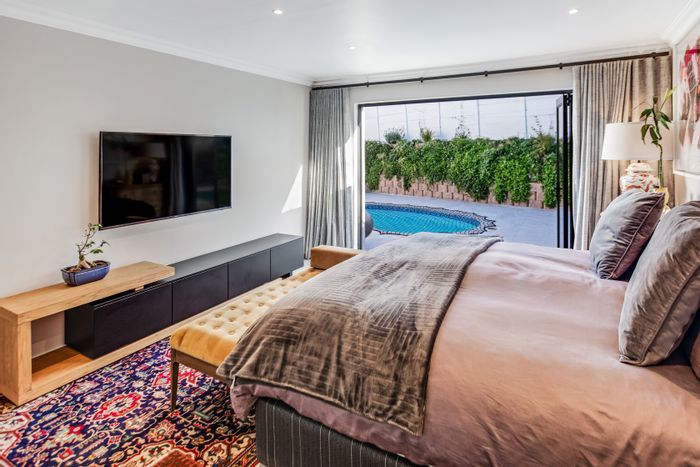 Coastal entertaining and relaxed living a short stroll from the beach and cafés, with private pool, garden, upstairs bar with fireplace and ocean-mountain views. Three beds, three baths.