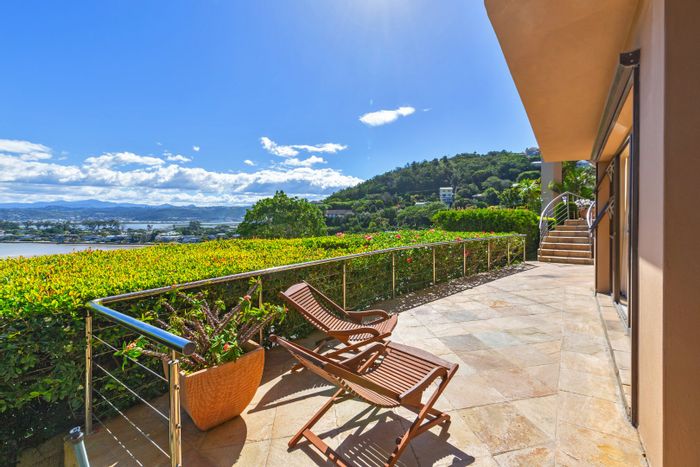 Perched over Knysna Lagoon with uninterrupted water views, this four-level contemporary home features double-volume living with stack-away glass doors, mezzanine studio, separate flatlet and a 3-minute walk to the water.
