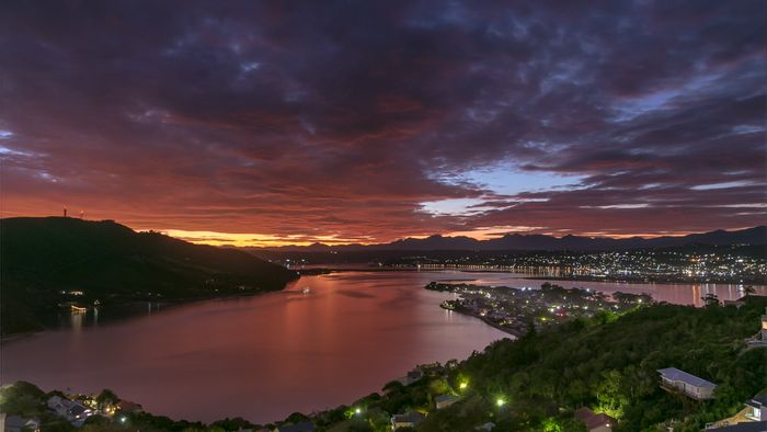 Elevated Knysna Heads plot overlooking the estuary—watch boats and sunset skies from a quiet cul-de-sac. Minimalist rectilinear home plans drawn; 935 m² freehold, no levies.