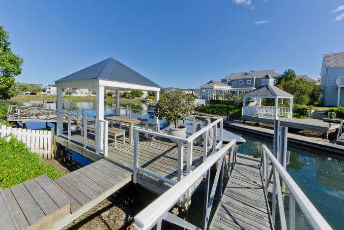 Waterfront marina living on Thesen Islands, enjoying Knysna Estuary views and Garden Route charm. Cape Vernacular home with glass stacking doors, private jetty and boathouse, four en-suite bedrooms.