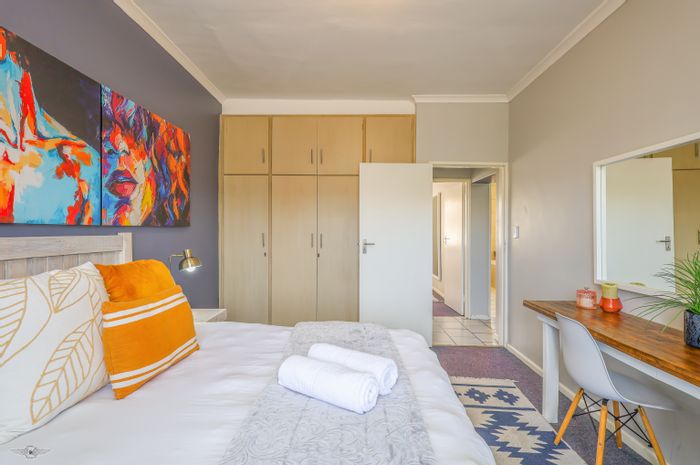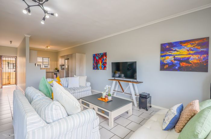 Beachside living steps from Langebaan's lively restaurants, bars and main beach, first-floor apartment with balcony, newly fitted gas kitchen and included furniture, two beds, one bath, parking.