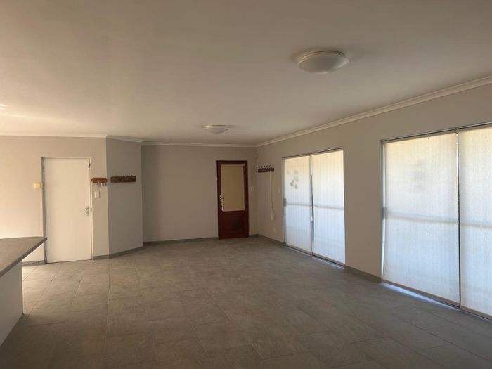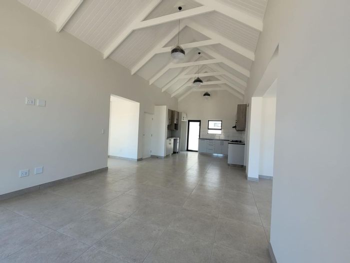 Relaxed Wildflower Estate living close to Curro schools, Laguna Mall and Club Mykonos — open-plan lounge leading to a patio with exterior braai. Two bedrooms, two bathrooms, double covered parking.