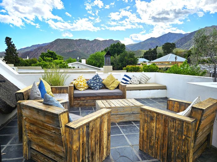 Relaxed small-town Montagu living with sweeping mountain views from a semi-wrap porch, loft charm, water-wise garden and splash pool; open-plan living, three bedrooms, two bathrooms and garage.