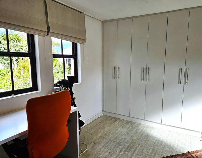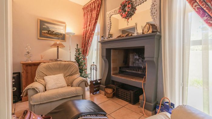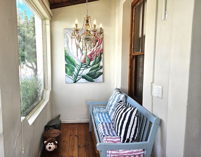 Relaxed village living with panoramic mountain views and a sun-soaked enclosed veranda. Dual-living potential with bachelor’s cottage, private garden and covered braai patio — four bedrooms, two bathrooms.