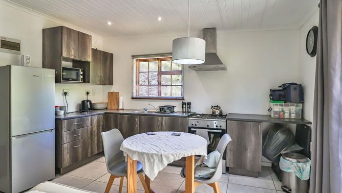 Relaxed village living with panoramic mountain views and a sun-soaked enclosed veranda. Dual-living potential with bachelor’s cottage, private garden and covered braai patio — four bedrooms, two bathrooms.