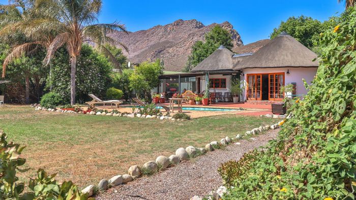 Embrace relaxed hillside living in Piet se Pad, Montagu, with sweeping Langeberg mountain views; double-volume entertainment area and guest cottage — four bedrooms, three bathrooms, double garage.