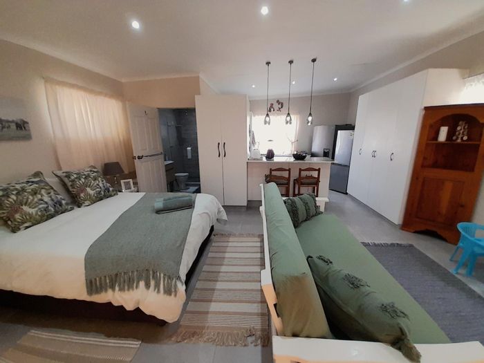 Relaxed coastal living in Klein Brak River, Mossel Bay, with panoramic mountain views from an upper-level patio, lush established gardens and a self-contained flatlet for guests.