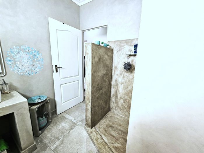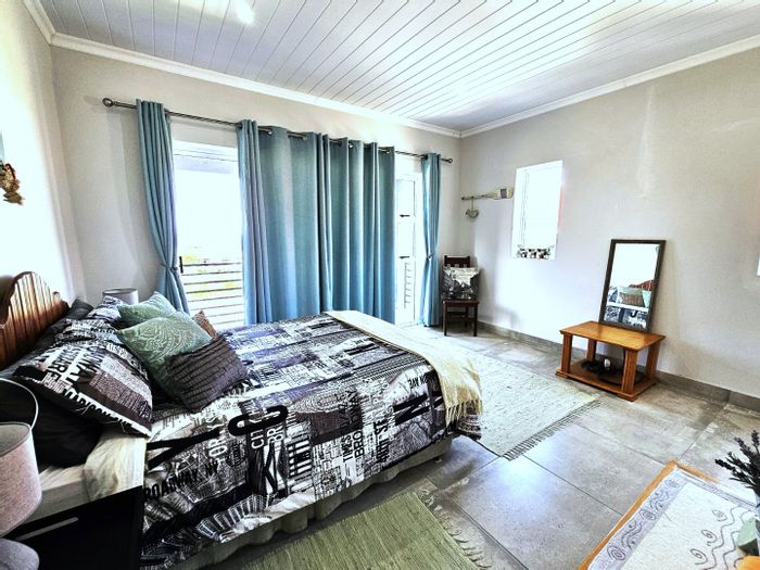 Coastal sanctuary with panoramic sea views, built-in braai and stained-glass sliders opening to an entertaining terrace. Ground-floor master, private balcony, walk-in butcher room, landscaped fenced garden, three bedrooms.