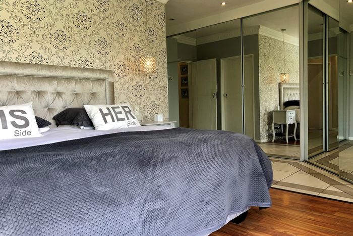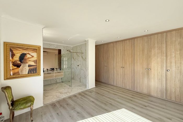 Panoramic Table Mountain views from prestigious Baronetcy Estate — contemporary showpiece with bespoke chef’s kitchen, heated pool, undercover braai and home cinema. 5 beds, 4 baths, 3 garages.