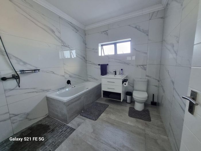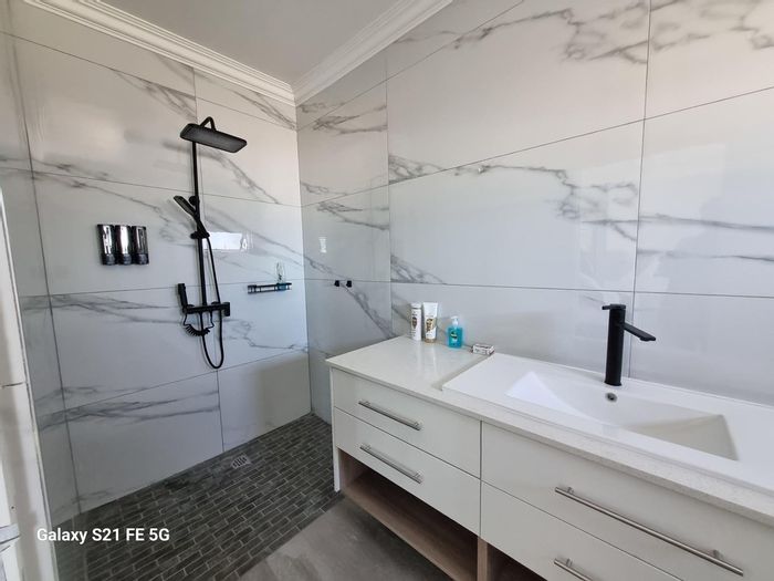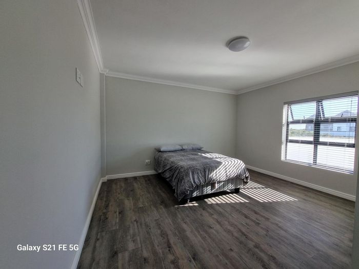 Sunny Hoogland single-storey rental offering relaxed entertaining on a patio with built-in braai and Saldanha harbour views; fully furnished, four bedrooms, four bathrooms, double garage.