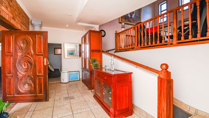 Coastal living steps from beach and lagoon, north-facing with level erf and mature trees. Dual-living design with two covered patios and built-in braai — five beds, three baths, double garage.