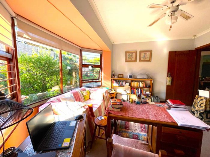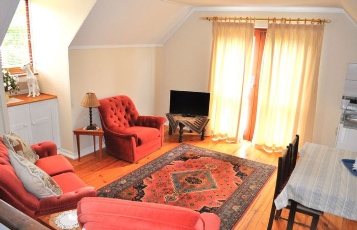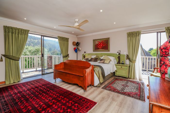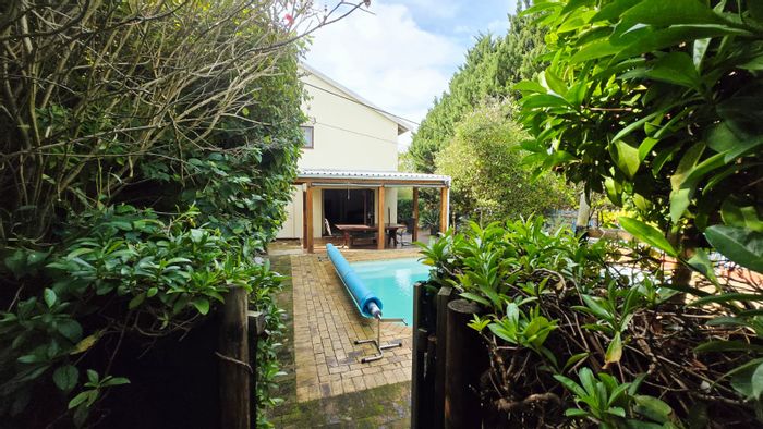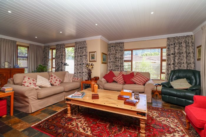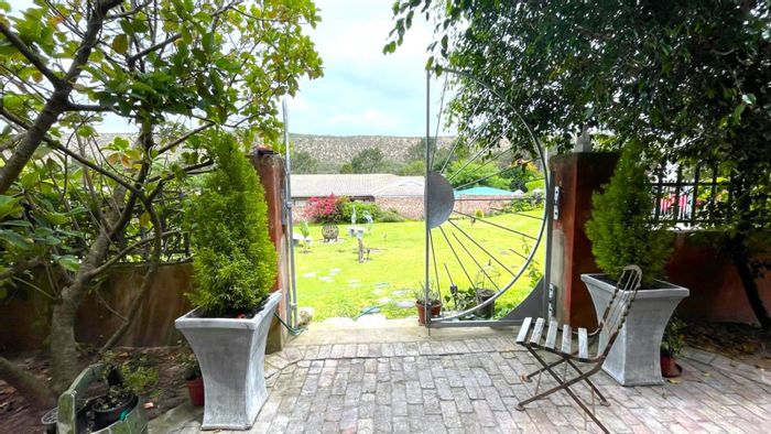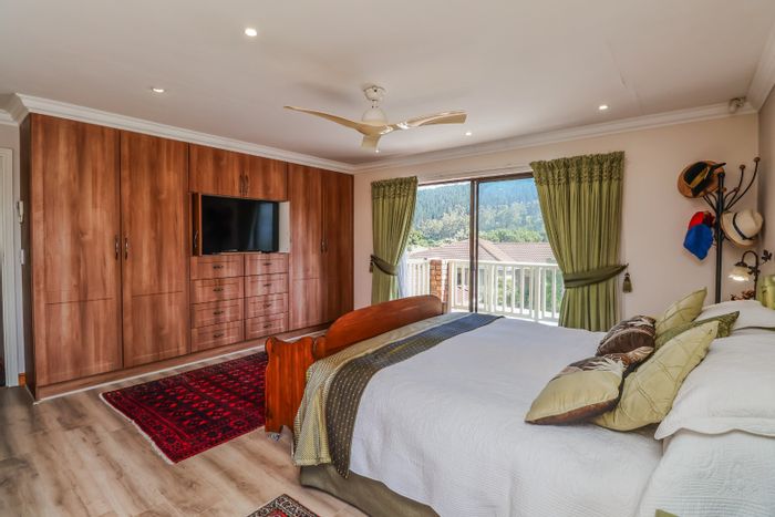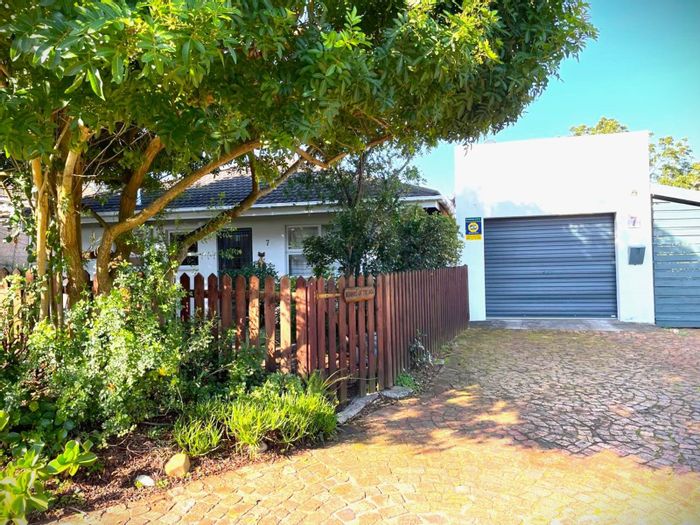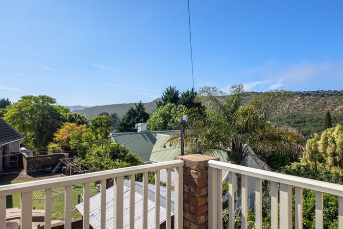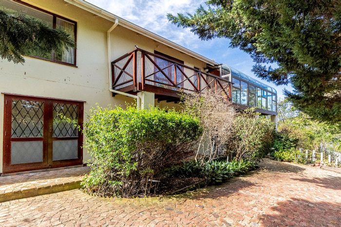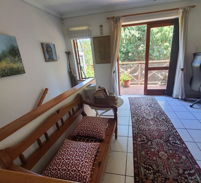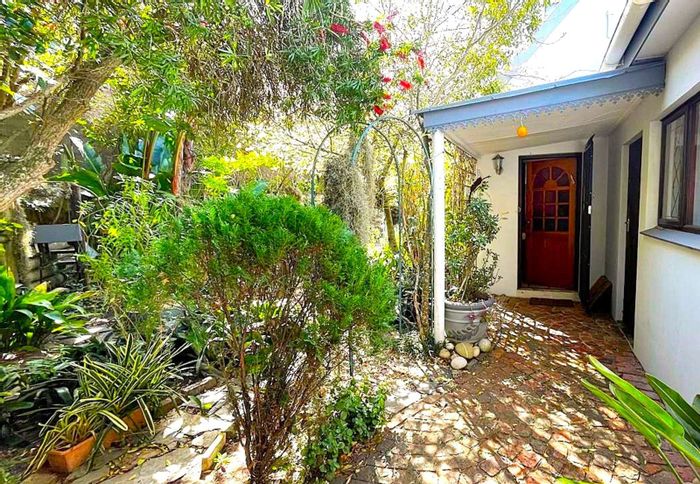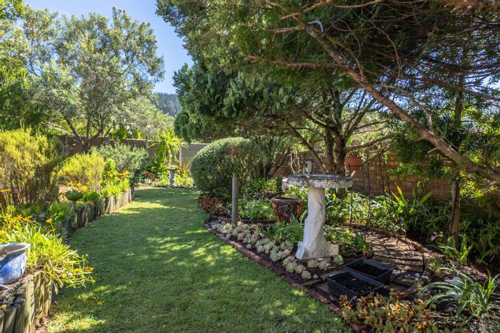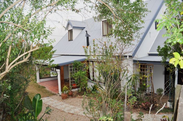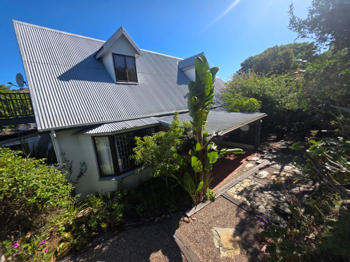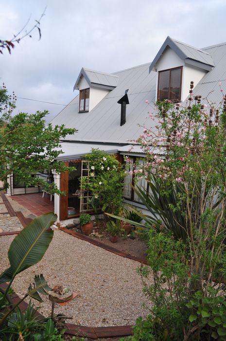 English country charmer in upper Groenvallei, Sedgefield — spring-bloom garden, bay and dormer windows, fireplace, patio and view balcony; self-contained upstairs ideal for B&B. 3 beds, 2 baths.