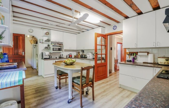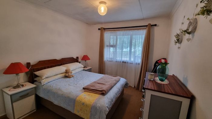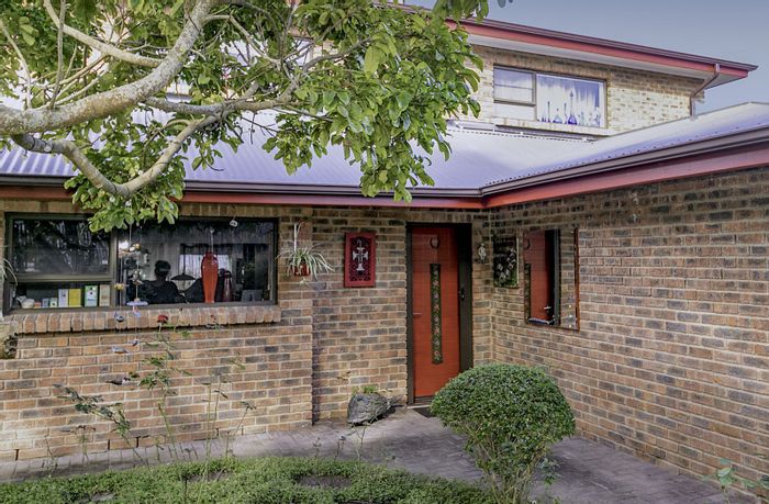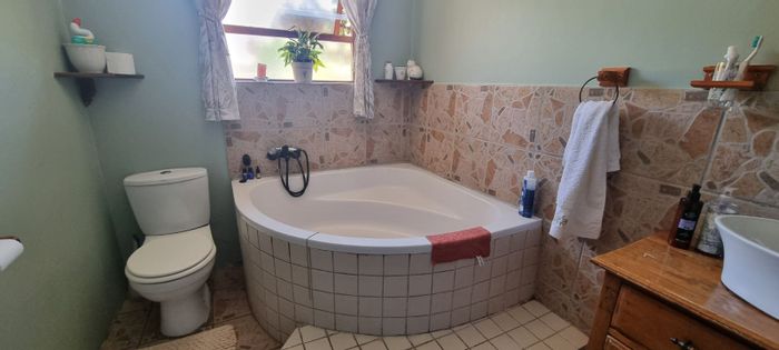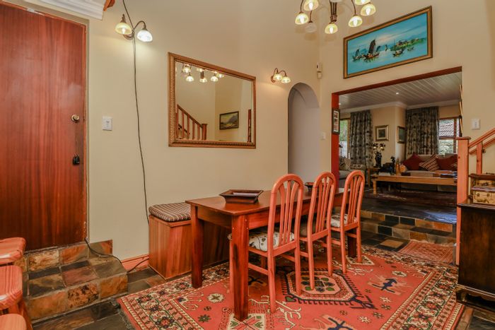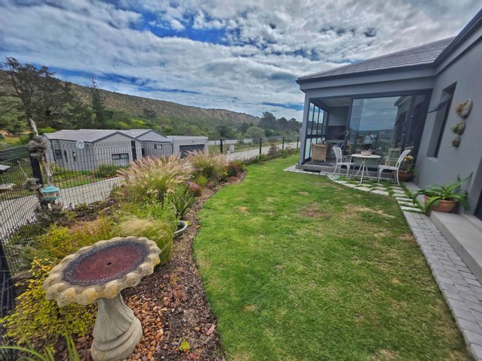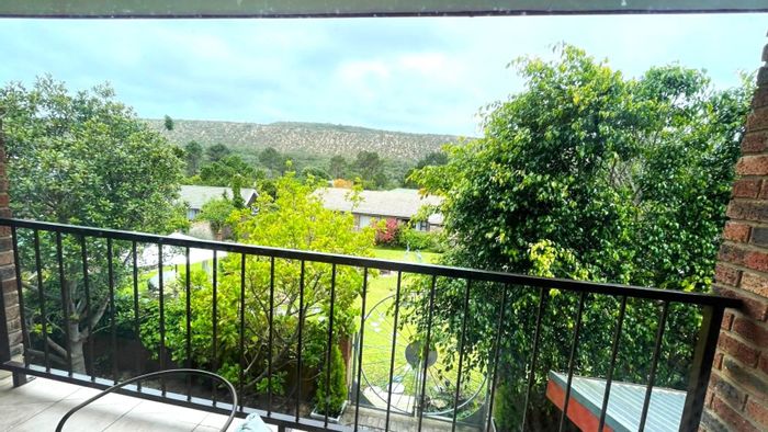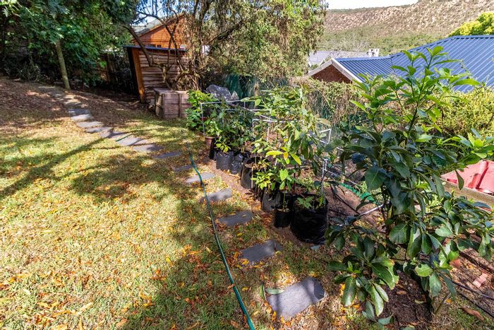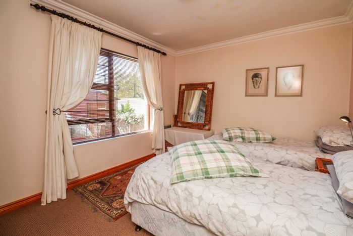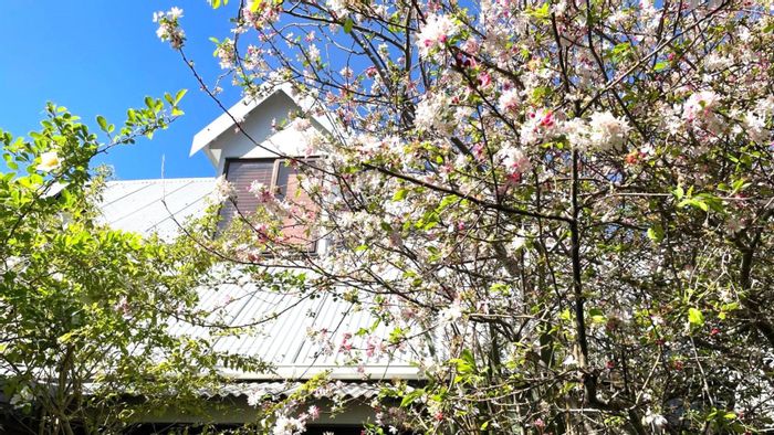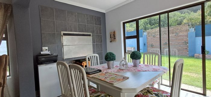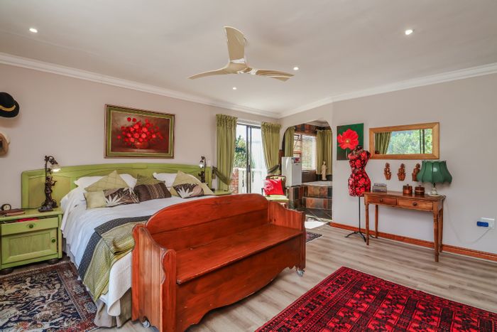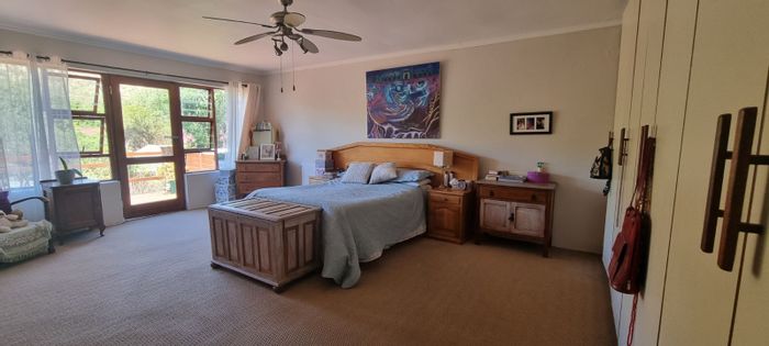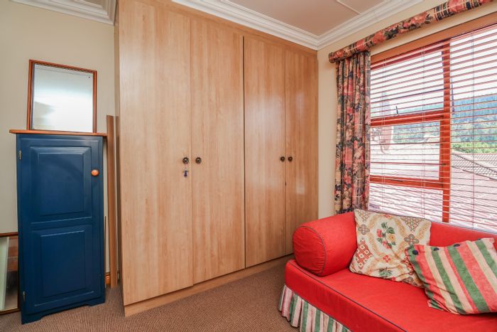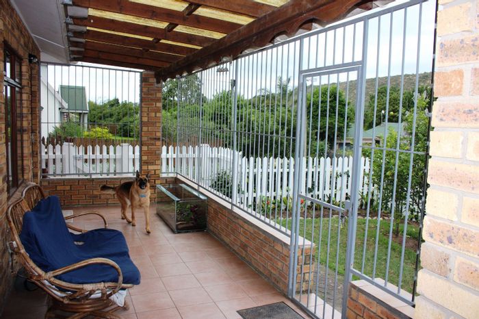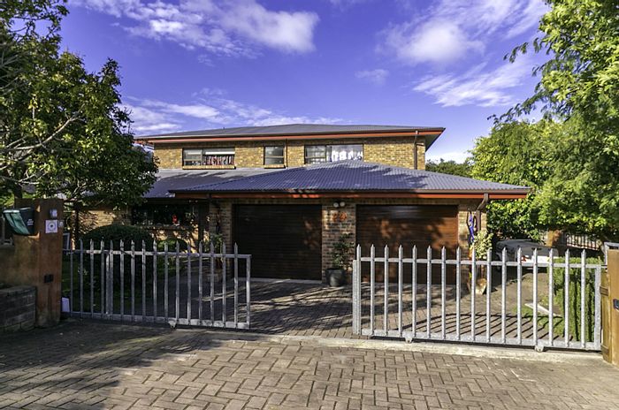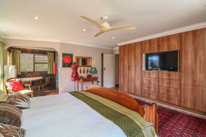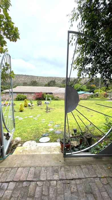 English country charmer in upper Groenvallei, Sedgefield — spring-bloom garden, bay and dormer windows, fireplace, patio and view balcony; self-contained upstairs ideal for B&B. 3 beds, 2 baths.