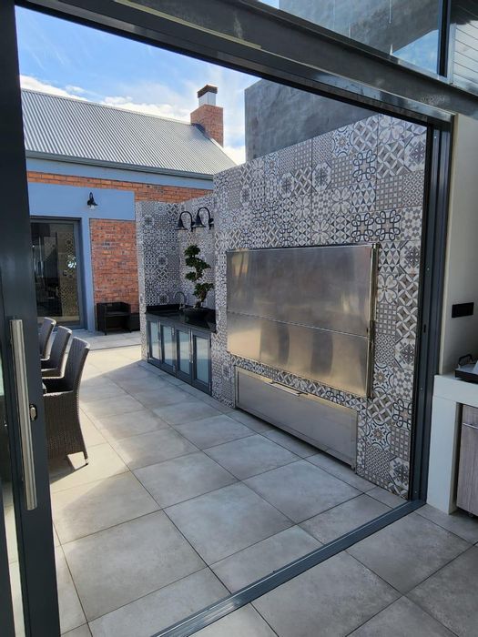 Coastal family living in Stilbaai, minutes from Lappiesbaai beach; seamless indoor-outdoor flow to an entertainment area with built-in braai and manicured garden. Three beds, two baths, double garage.
