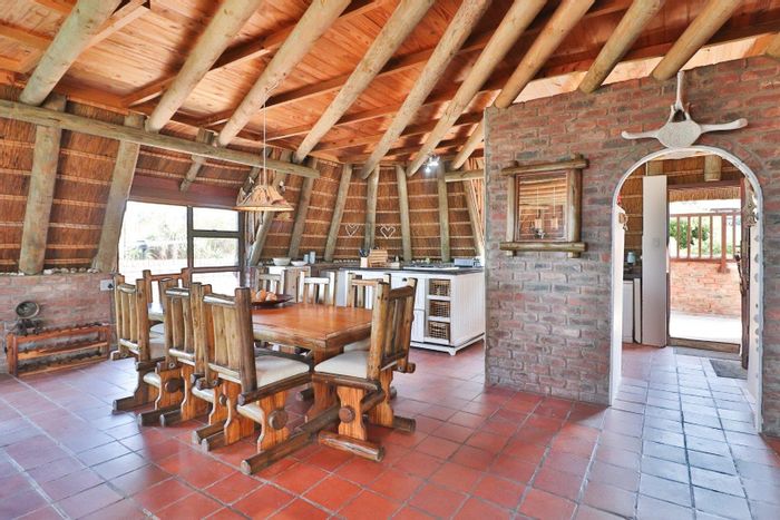 5-bedroom thatch roof home with river views, open-plan living, indoor braai, and eco-friendly features in a secure estate.