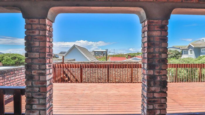 Coastal family retreat 200m from the sea in Struisbaai, U-shaped home with private garden and courtyard braai, sea-view terrace and flexible 5-bed, 4-bath, 2-garage layout.