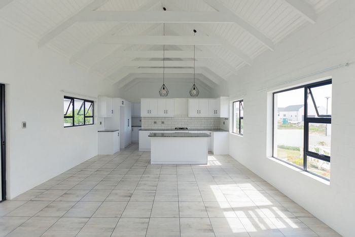 Secure coastal family living in Atlantic Shores Estate, Velddrif — close to beach and river. Open-plan home with kitchen island and covered patio with braai; three bedrooms, two bathrooms, double garage.