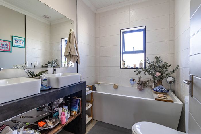 Relaxed West Coast beach living steps from Dwarskersbos beach in a double-storey home with private pool — three bedrooms, 2.5 bathrooms and covered triple parking for family living.