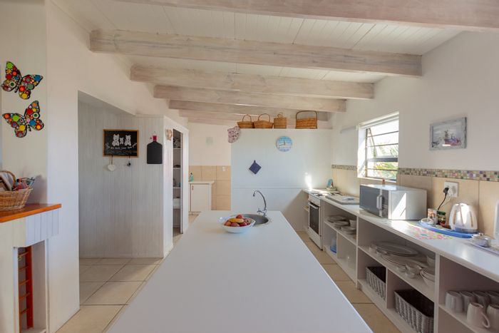Beachside lifestyle in Dwarskersbos — perfect for relaxed entertaining with a built-in braai and covered outdoor area; loft with private balcony and ocean views. Four bedrooms, two bathrooms, double garage.