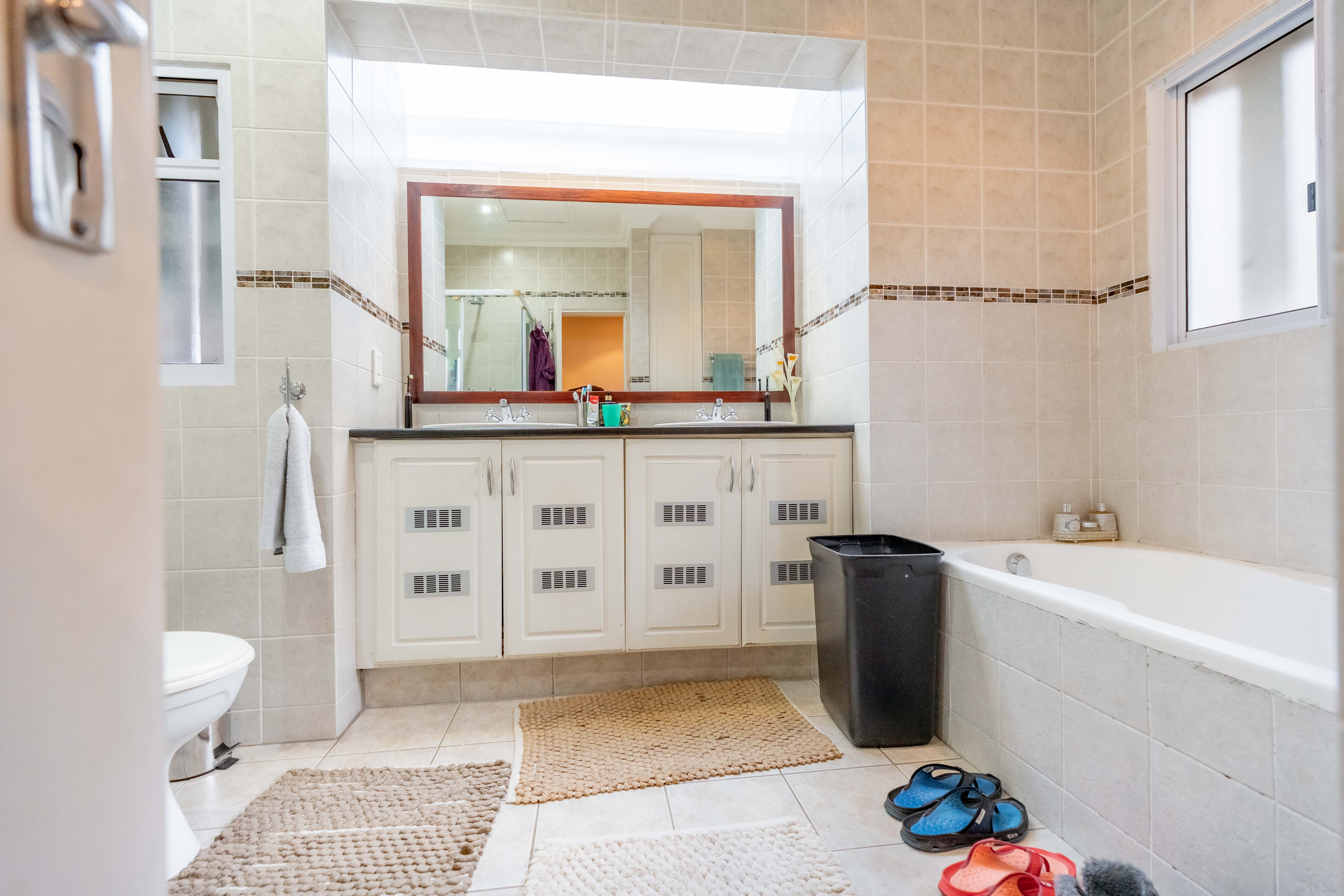 The sleeping wing, thoughtfully separated from the living areas, ensures tranquility. It features four spacious bedrooms with built-in cupboards, a full family bathroom with shower, tub, and hand shower, a separate guest toilet, and a master suite. The master retreat includes a study nook, walk-in robe, sunken bedroom, and a full en-suite with a skylight, his-and-her basins, shower, and tub—an oasis of calm.