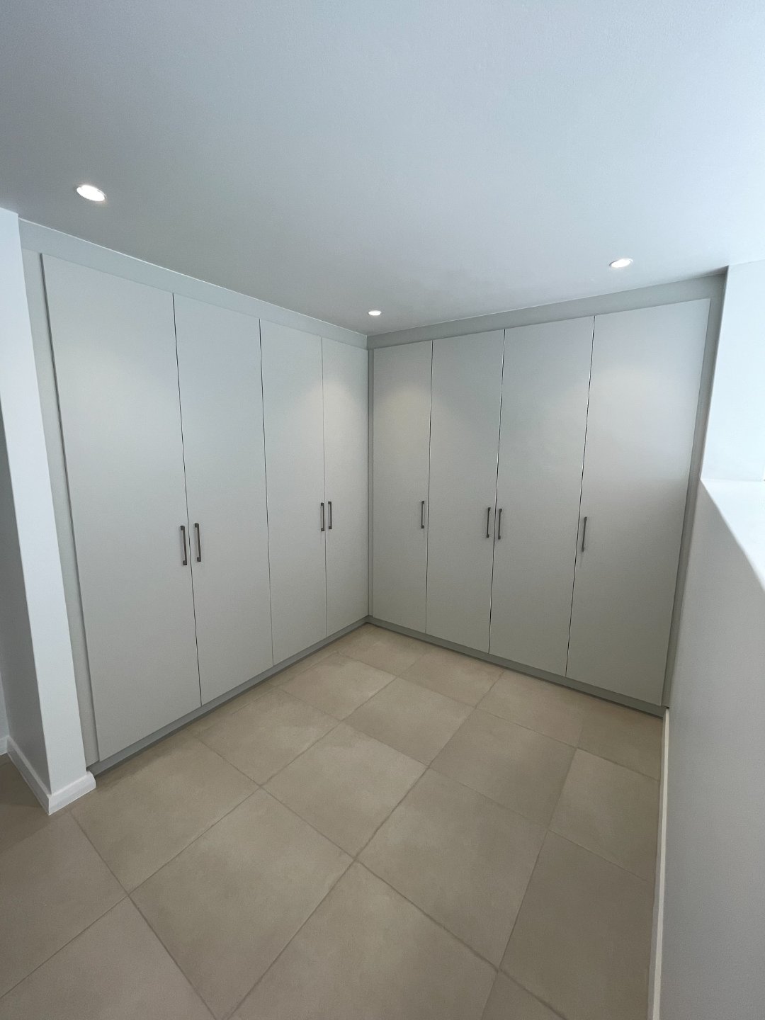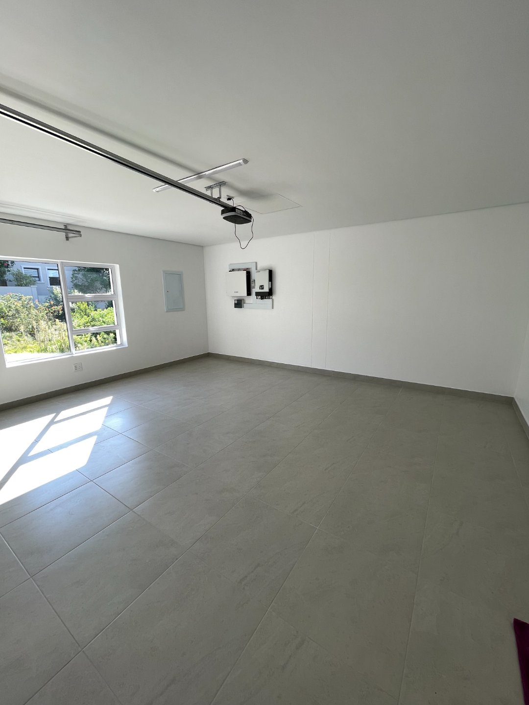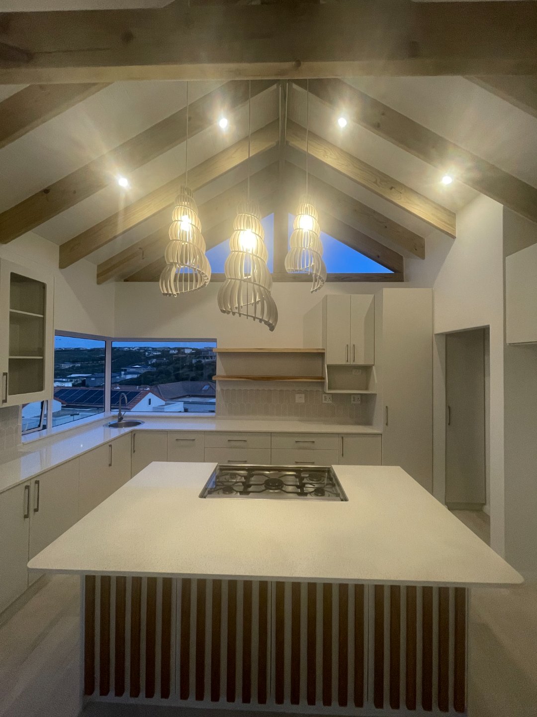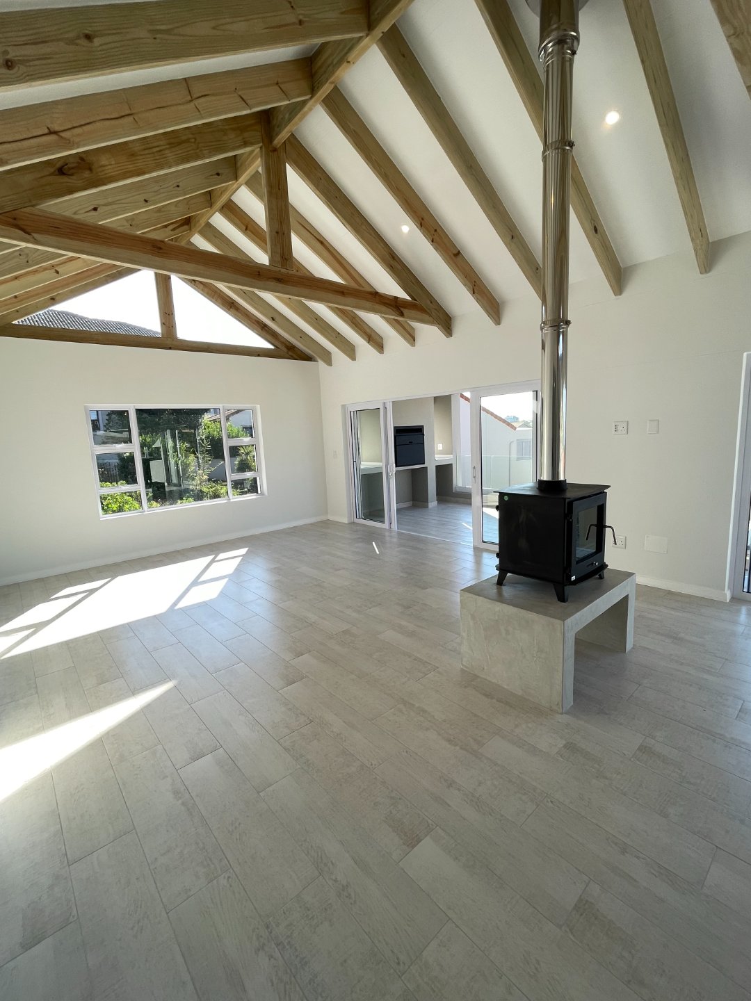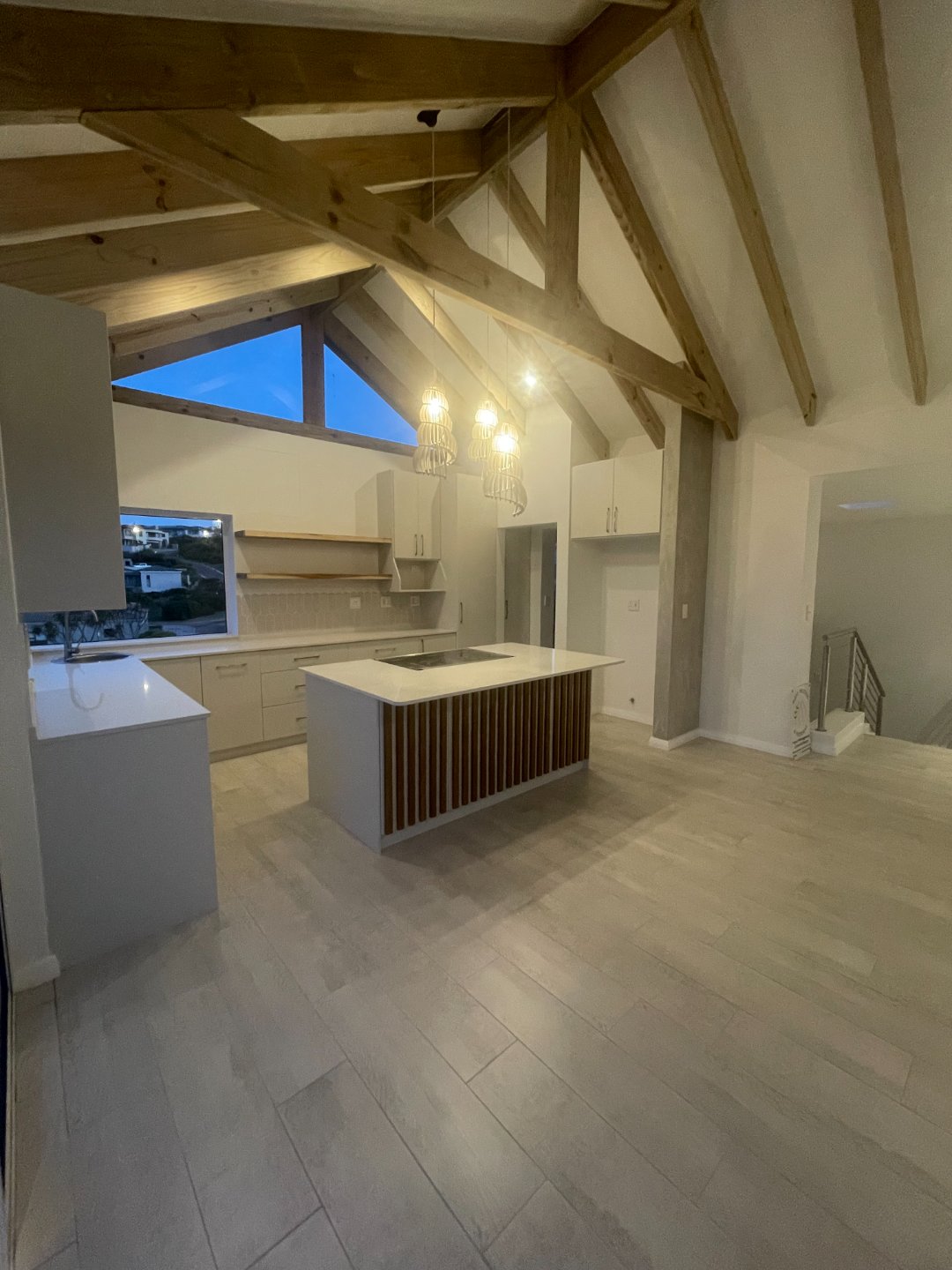 From the moment you step inside, you’re greeted by natural light streaming through skylights and expansive glass doors, illuminating the open-plan interior. The double-volume ceilings with exposed rafters create an airy and inviting atmosphere, seamlessly connecting the lounge, dining area, and a contemporary kitchen complete with a central quartz island, soft-close cabinetry, and a 5-burner gas hob. A separate scullery ensures a clutter-free space with ample room for appliances.