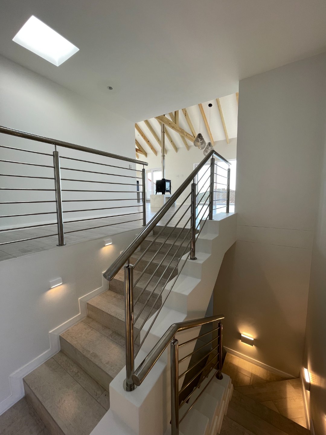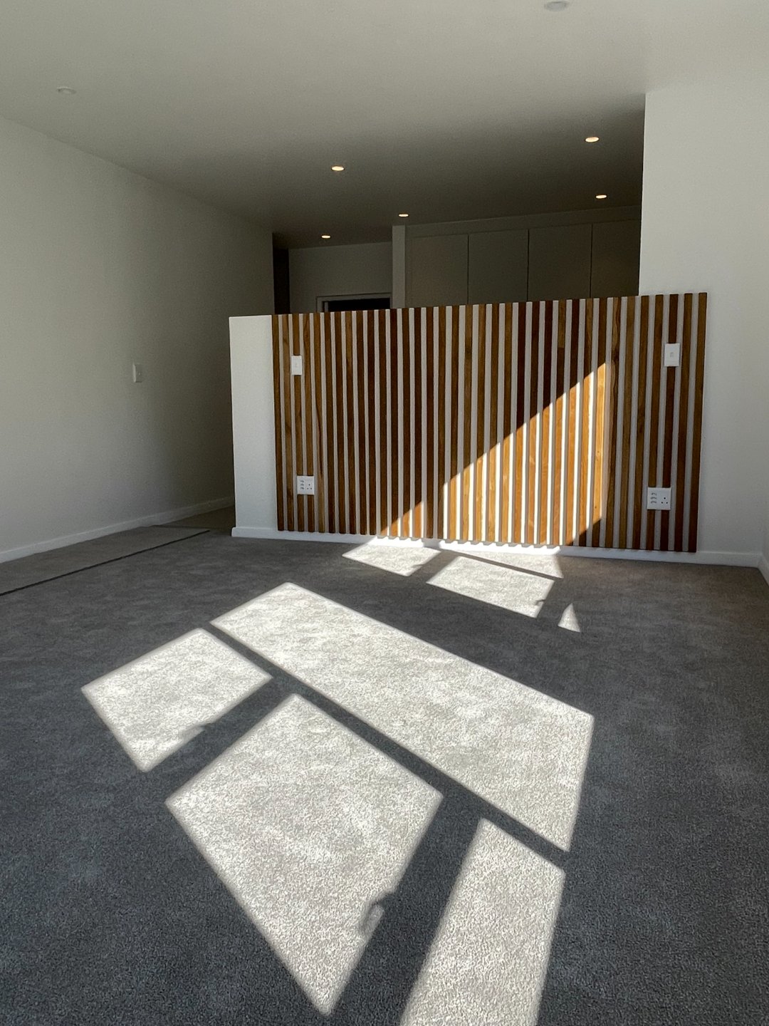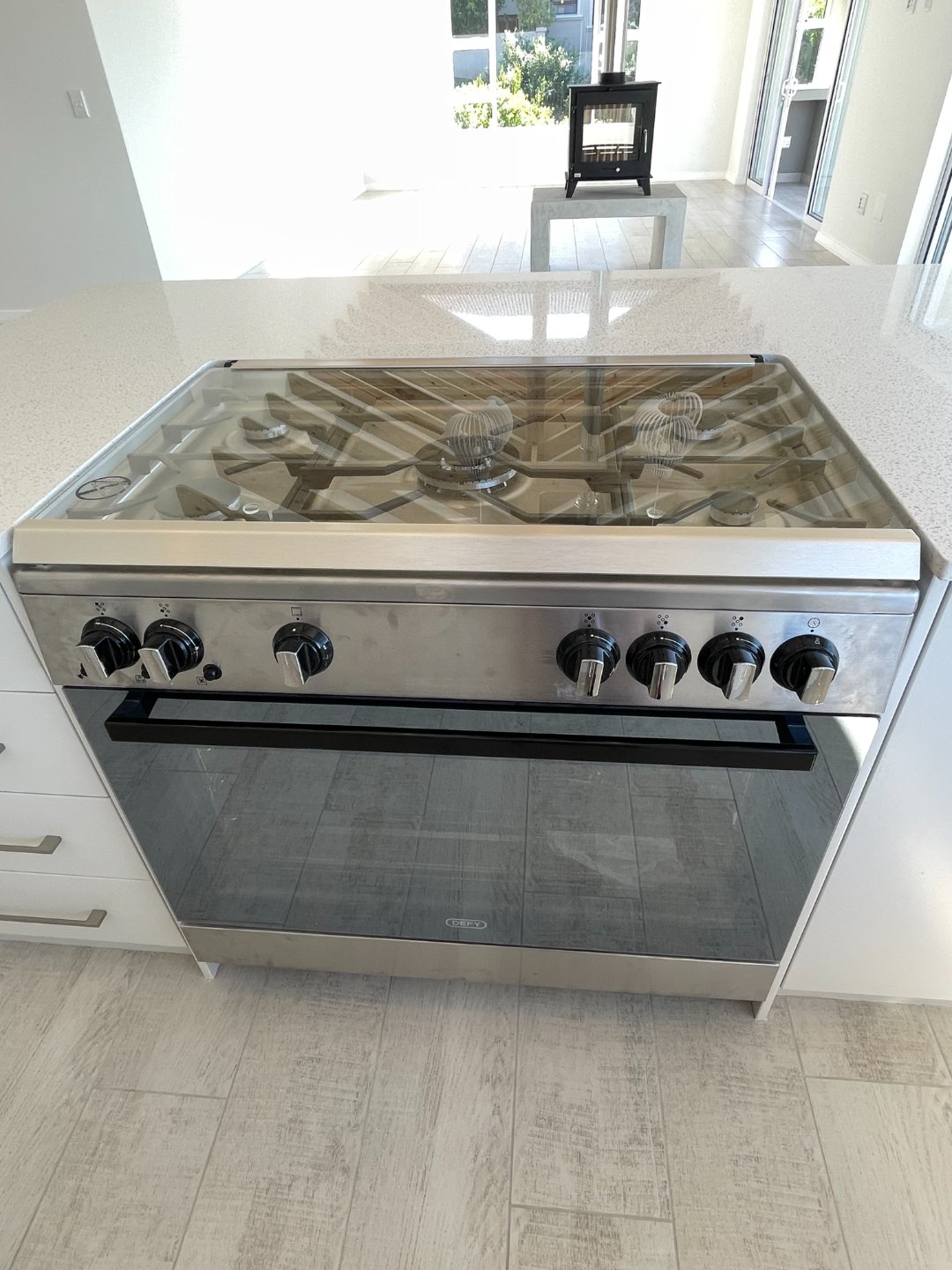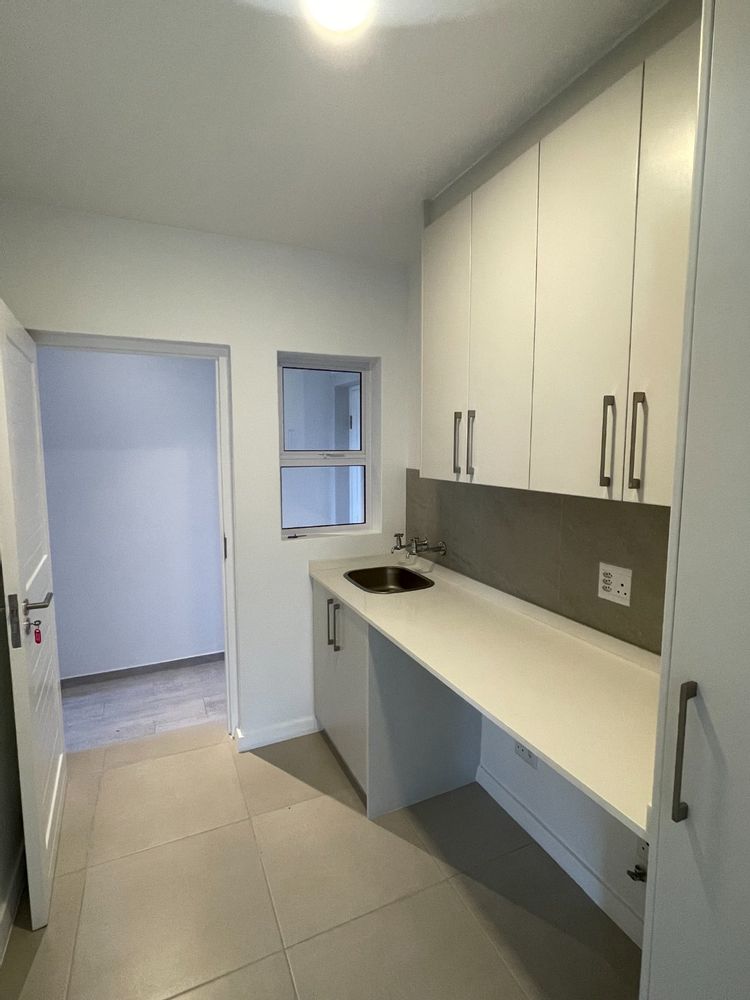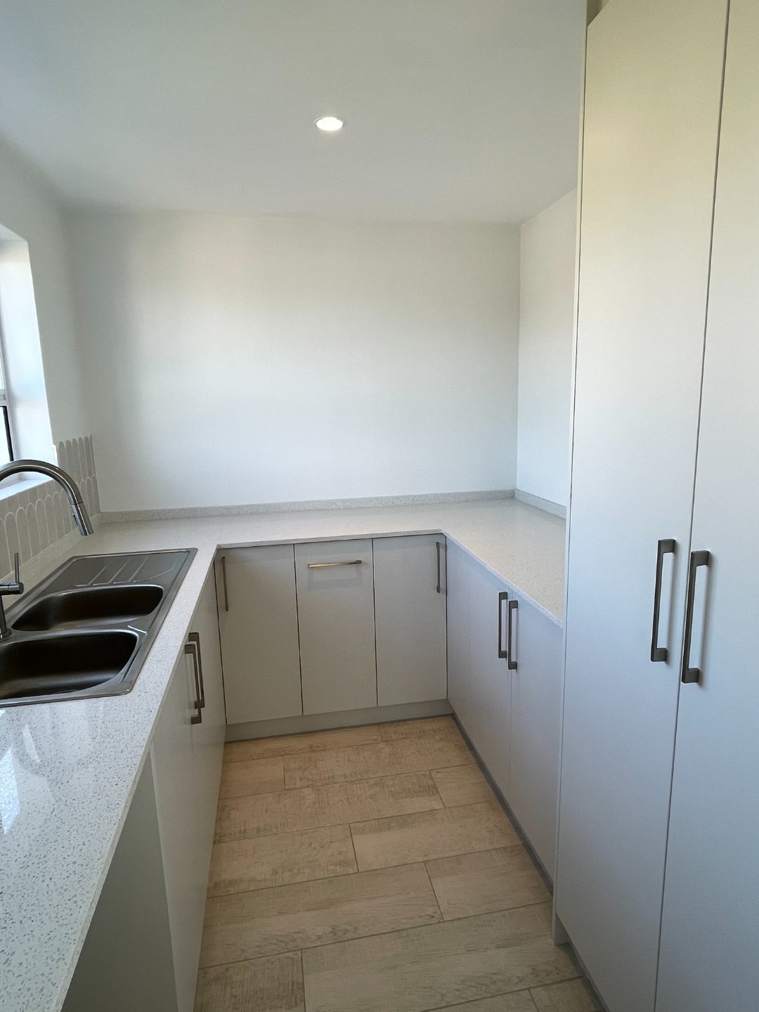 From the moment you step inside, you’re greeted by natural light streaming through skylights and expansive glass doors, illuminating the open-plan interior. The double-volume ceilings with exposed rafters create an airy and inviting atmosphere, seamlessly connecting the lounge, dining area, and a contemporary kitchen complete with a central quartz island, soft-close cabinetry, and a 5-burner gas hob. A separate scullery ensures a clutter-free space with ample room for appliances.