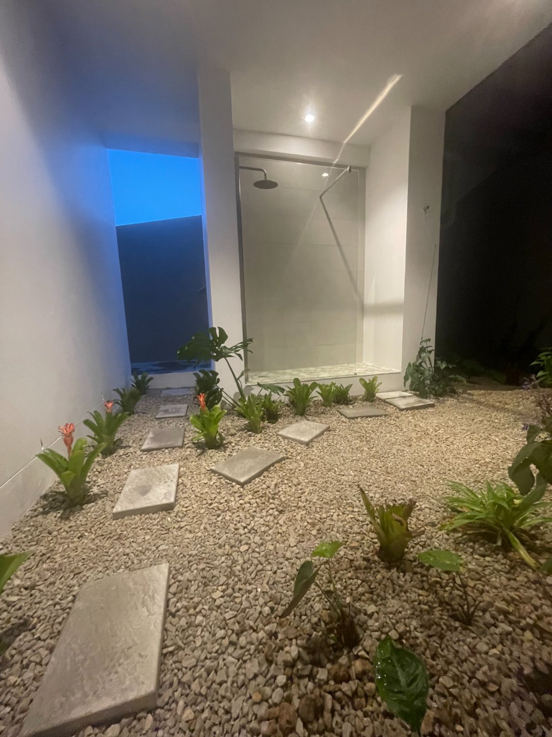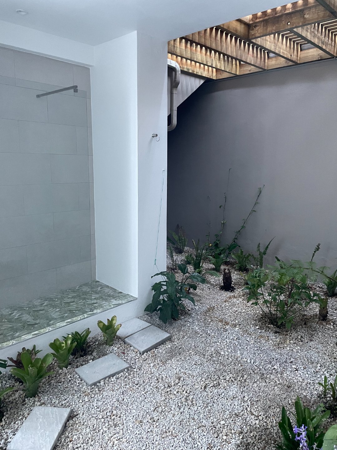 Beautifully landscaped walkways and a designer outdoor shower for post-beach rinses