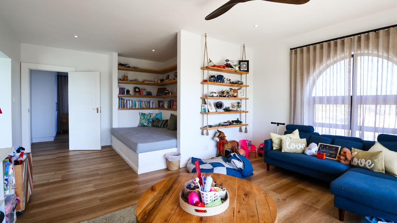 A stylish guest room downstairs ensures visitors feel at home, while the playroom, study, and cozy wooden fireplace in the lounge add warmth and character. The home's clean architectural lines provide a blank canvas for artwork and design, with subtle accent lighting enhancing rather than overwhelming the space.