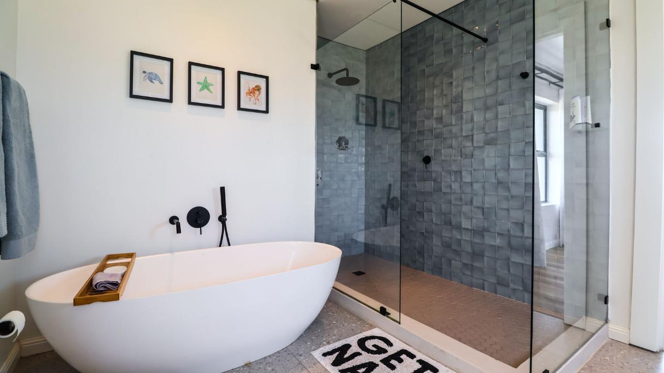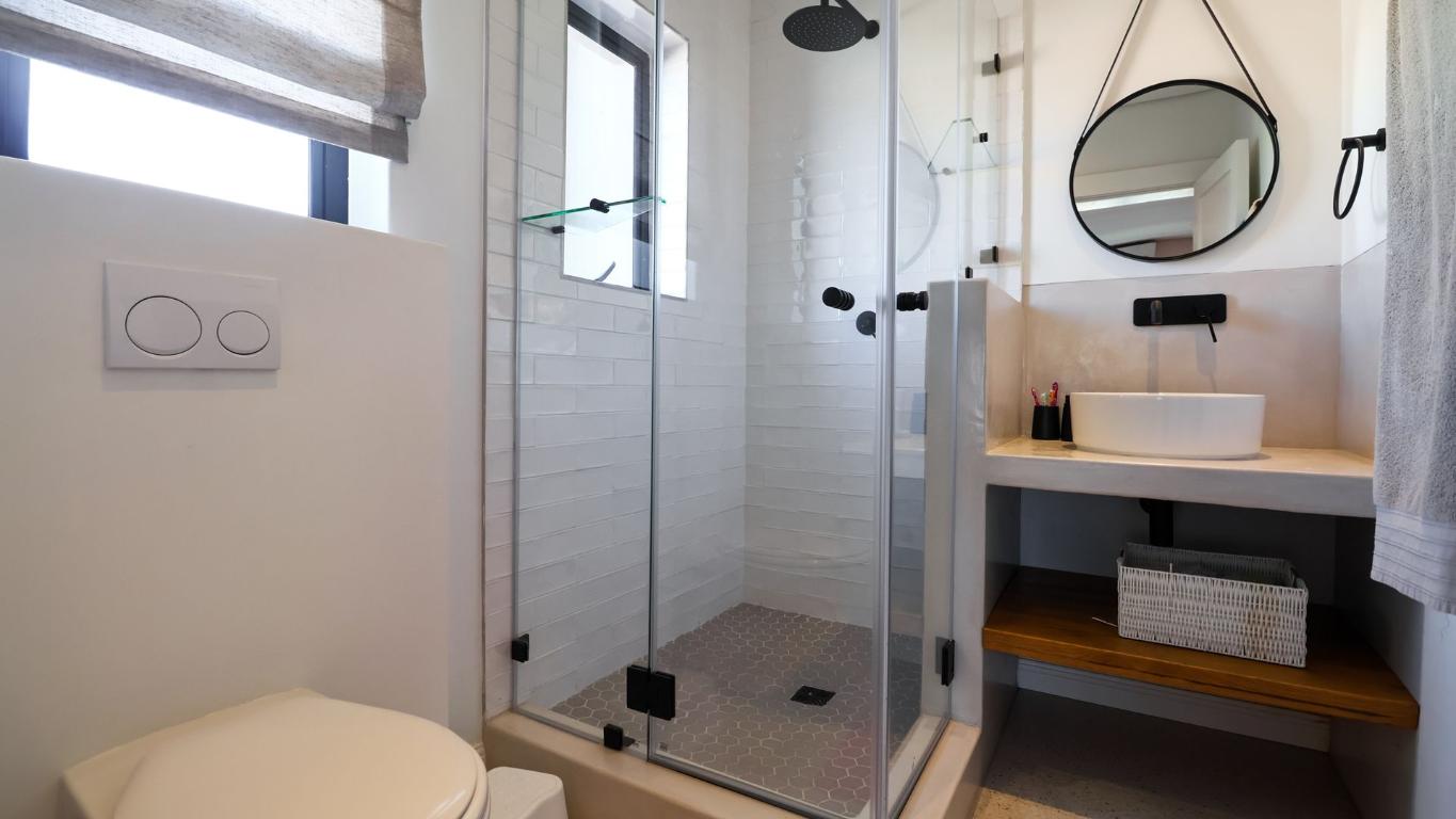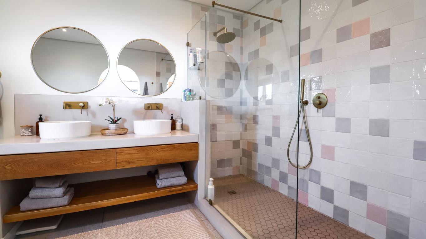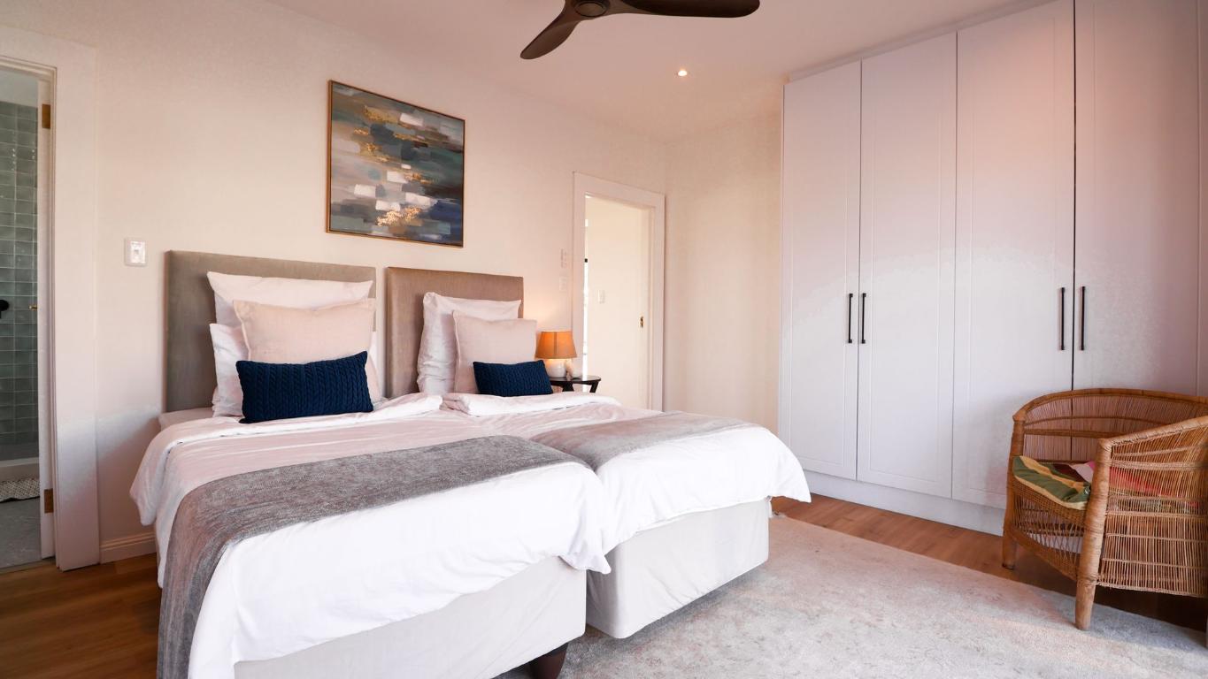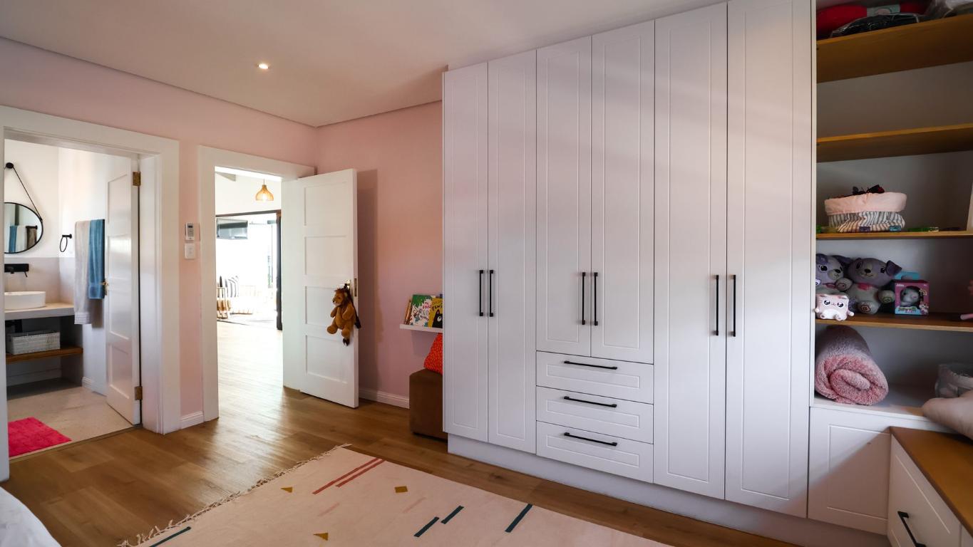 With six bedrooms, including a separate one-bedroom flatlet with its own lounge and kitchen, this home accommodates family and guests with ease. Upstairs, four spacious bedrooms provide privacy and tranquility. Two en-suite bedrooms feature sleek glass showers and muted tile tones, while two additional bedrooms share a full bath—ideal for children, with the flexibility to personalize the aesthetic.
