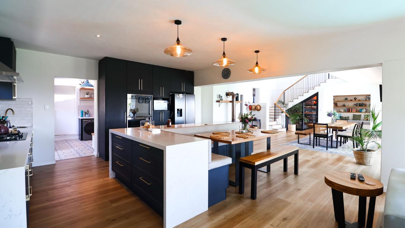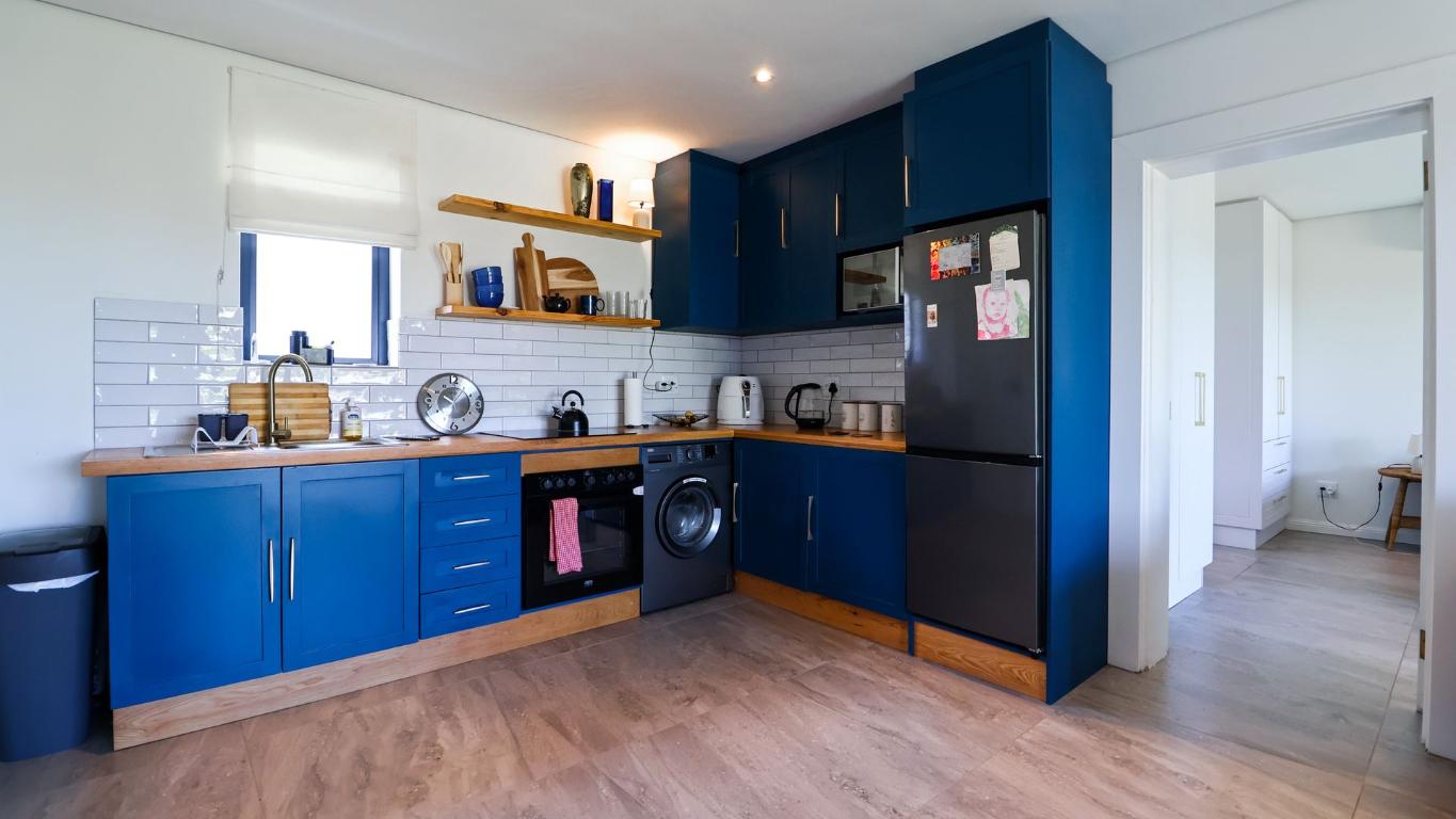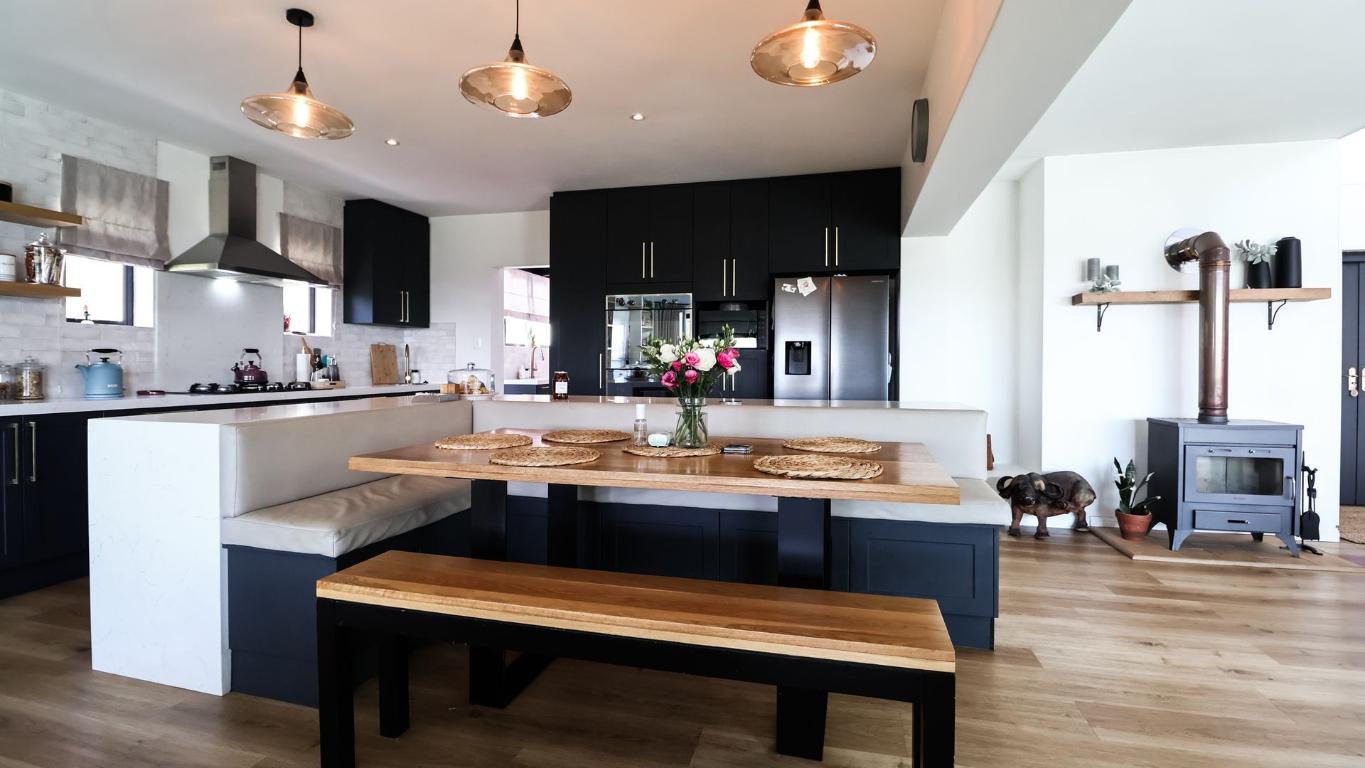 Host elegant long-table dinners or enjoy relaxed meals tucked into the L-shaped kitchen nook. The streamlined, well-appointed kitchen is both functional and social, featuring a fitted breakfast bar, state-of-the-art ovens, and a large gas hob—all with captivating sea and mountain views. A glass-roofed scullery adds both practicality and elegance, ensuring a clutter-free space.