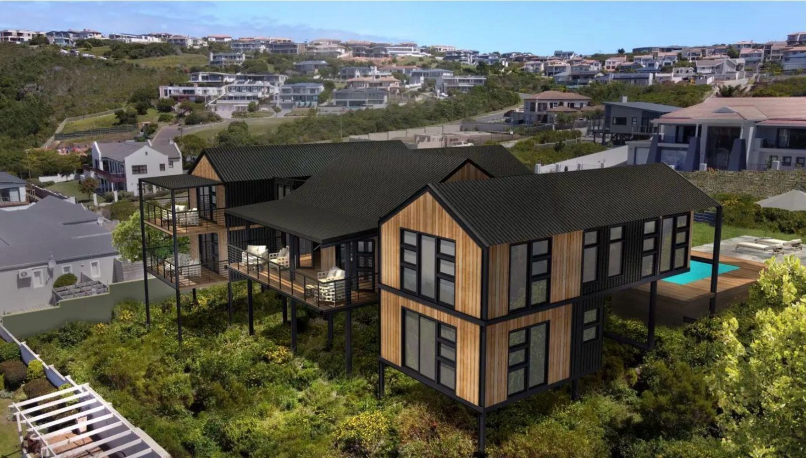 With its warm timber cladding, sleek metal detailing, and elevated design, this home blends coastal sophistication with contemporary flair. The structure’s modular, cost-effective design ensures a quicker build time than traditional methods — allowing you to move in and start living the Plettenbergbay lifestyle sooner!