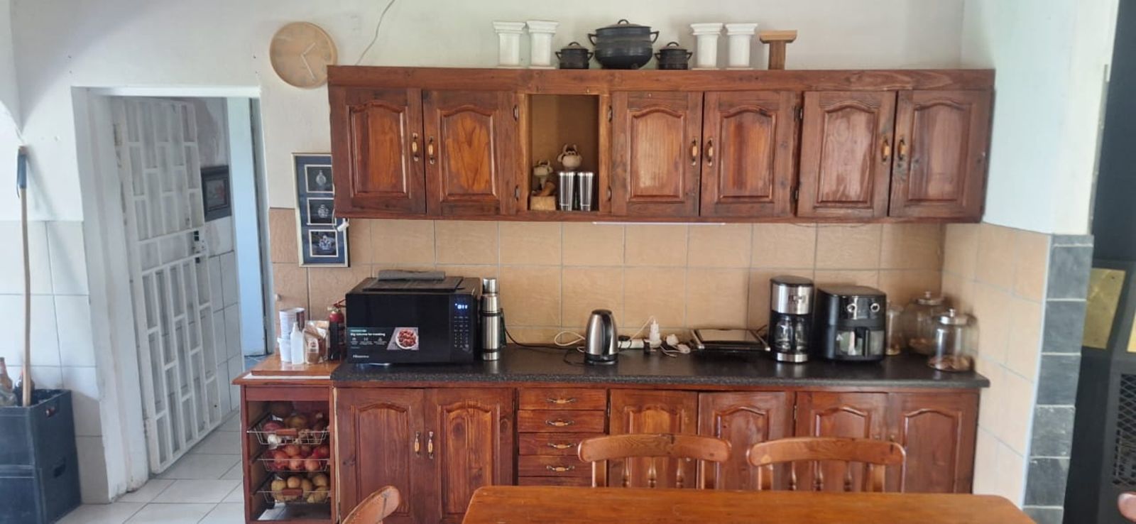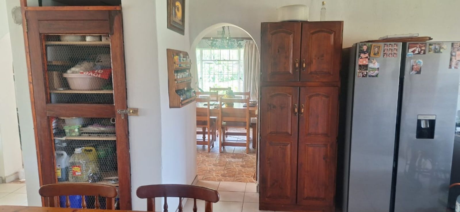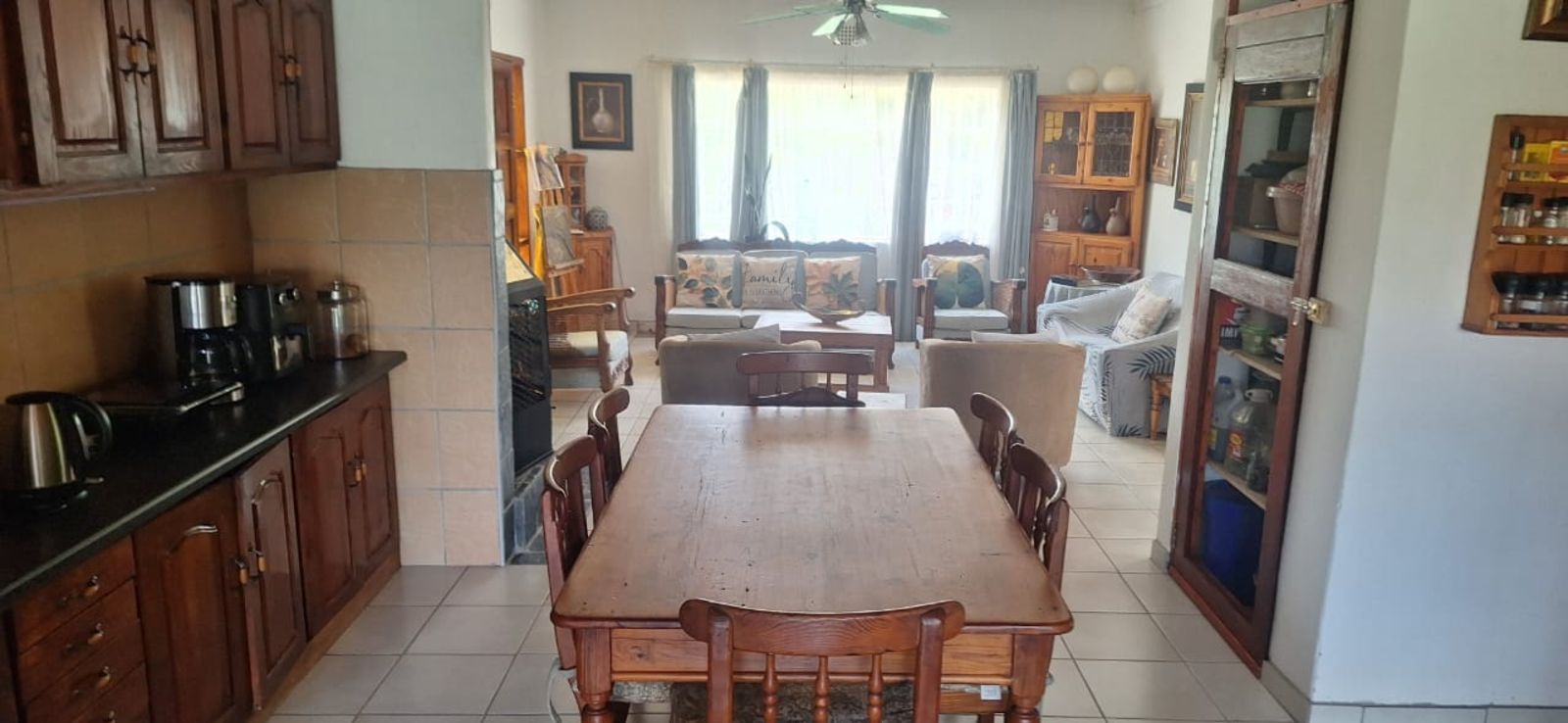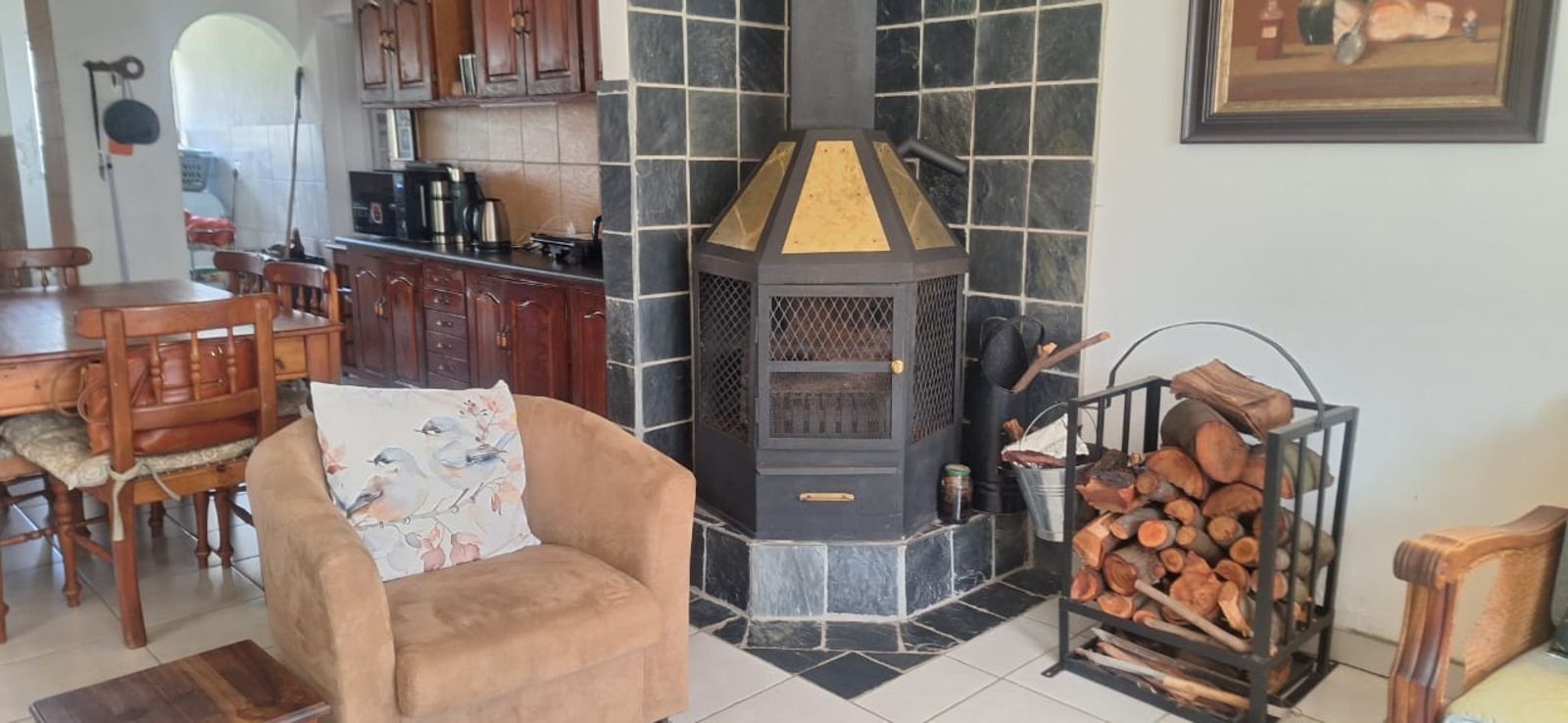The main house is spacious, warm, and extremely well cared for, featuring 41⁄2 bedrooms, all tiled and fitted with built-in cupboards. The home includes one en-suite bathroom and an additional full family bathroom. The expansive open-plan lounge and dining area is the heart of the home, boasting a powerful built-in fireplace that efficiently heats the entire house during winter, creating a cosy and comfortable living environment. A separate office makes working from home practical and convenient, while the neat, functional kitchen completes this inviting living space.