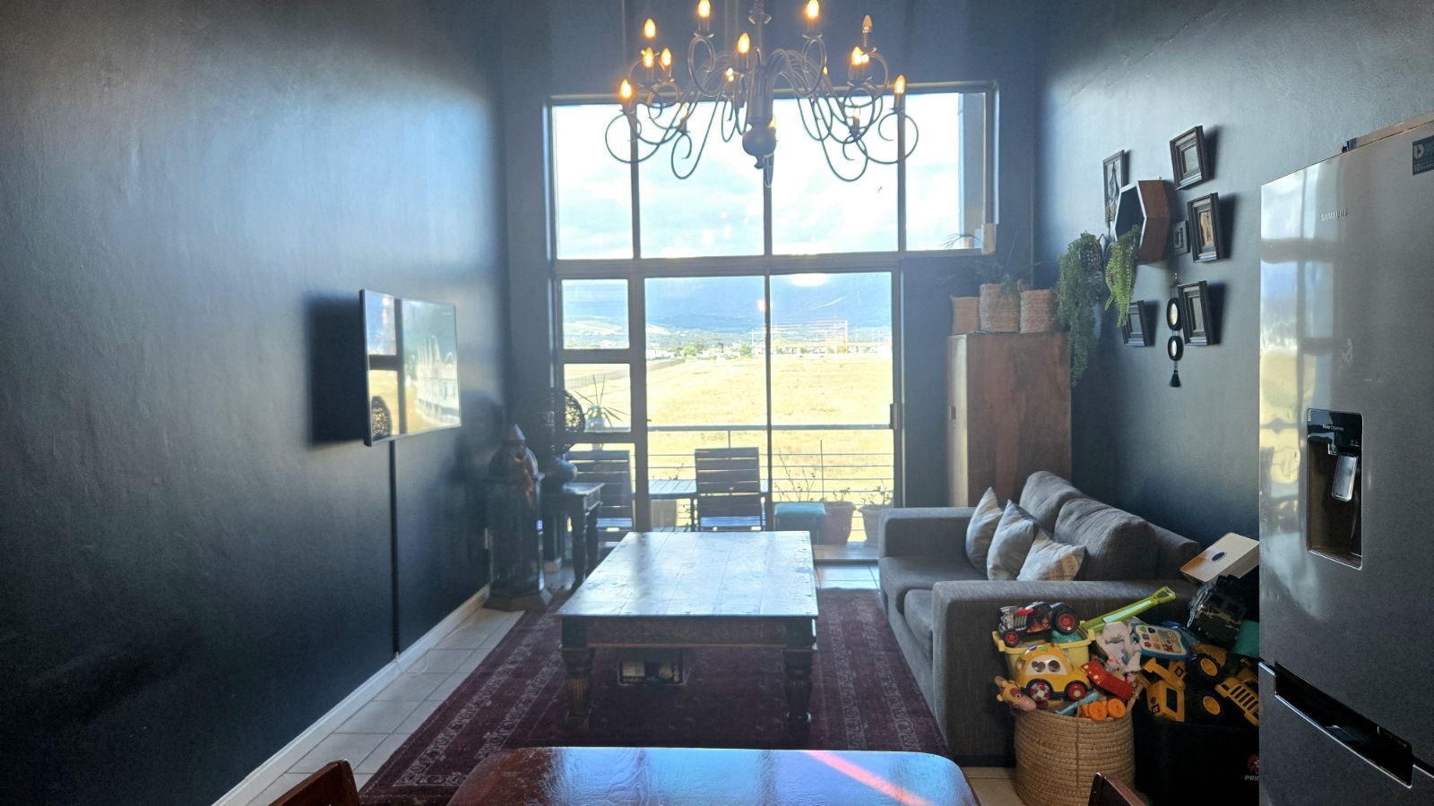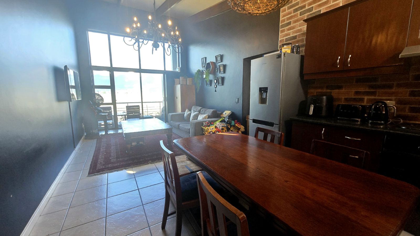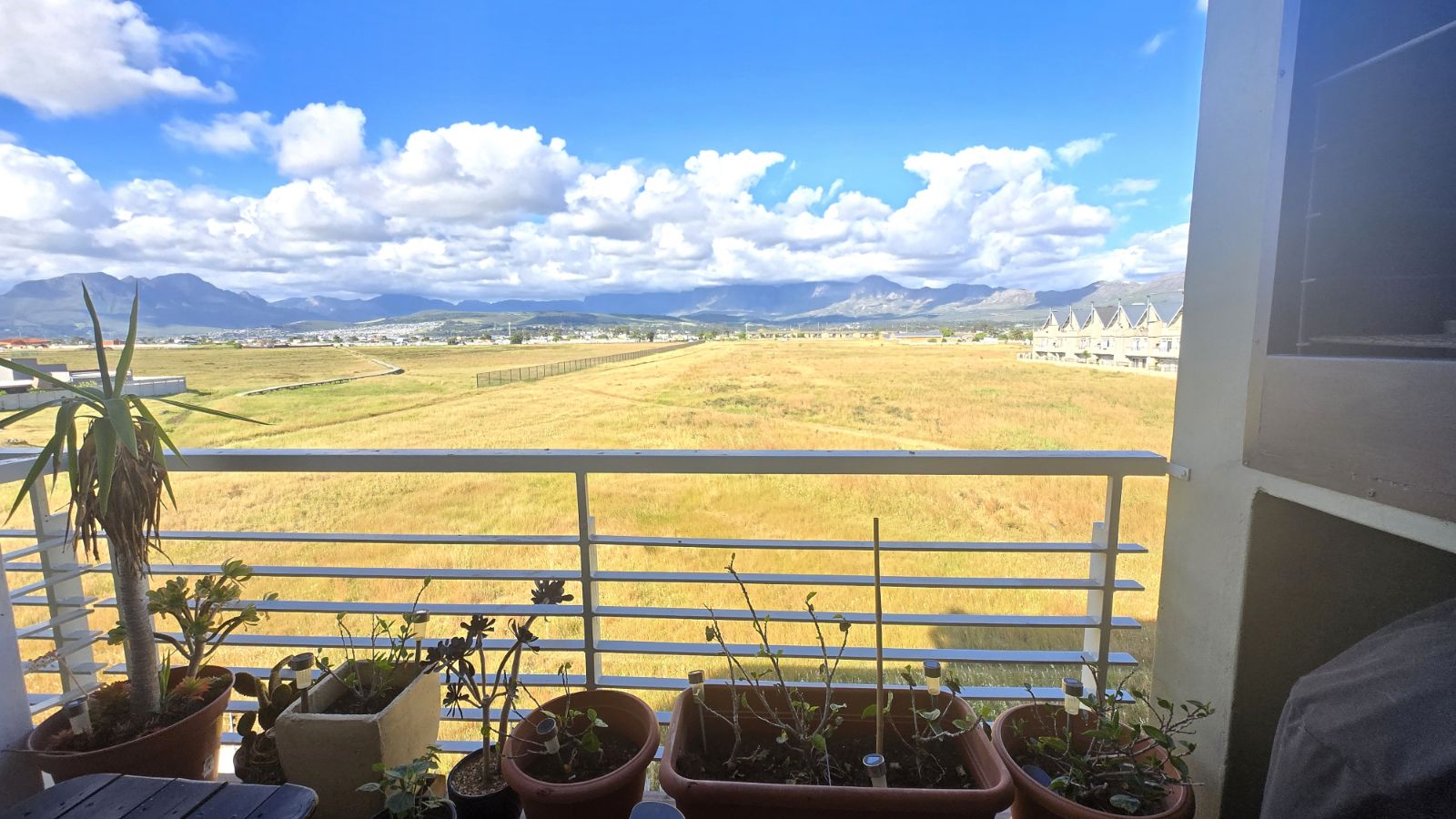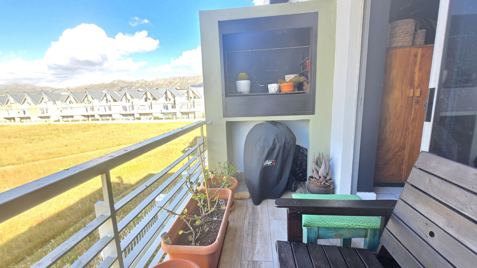 The open plan kitchen and living area create a bright, welcoming space that flows seamlessly onto a private balcony with a built-in braai, perfect for relaxing while enjoying the mountain views.