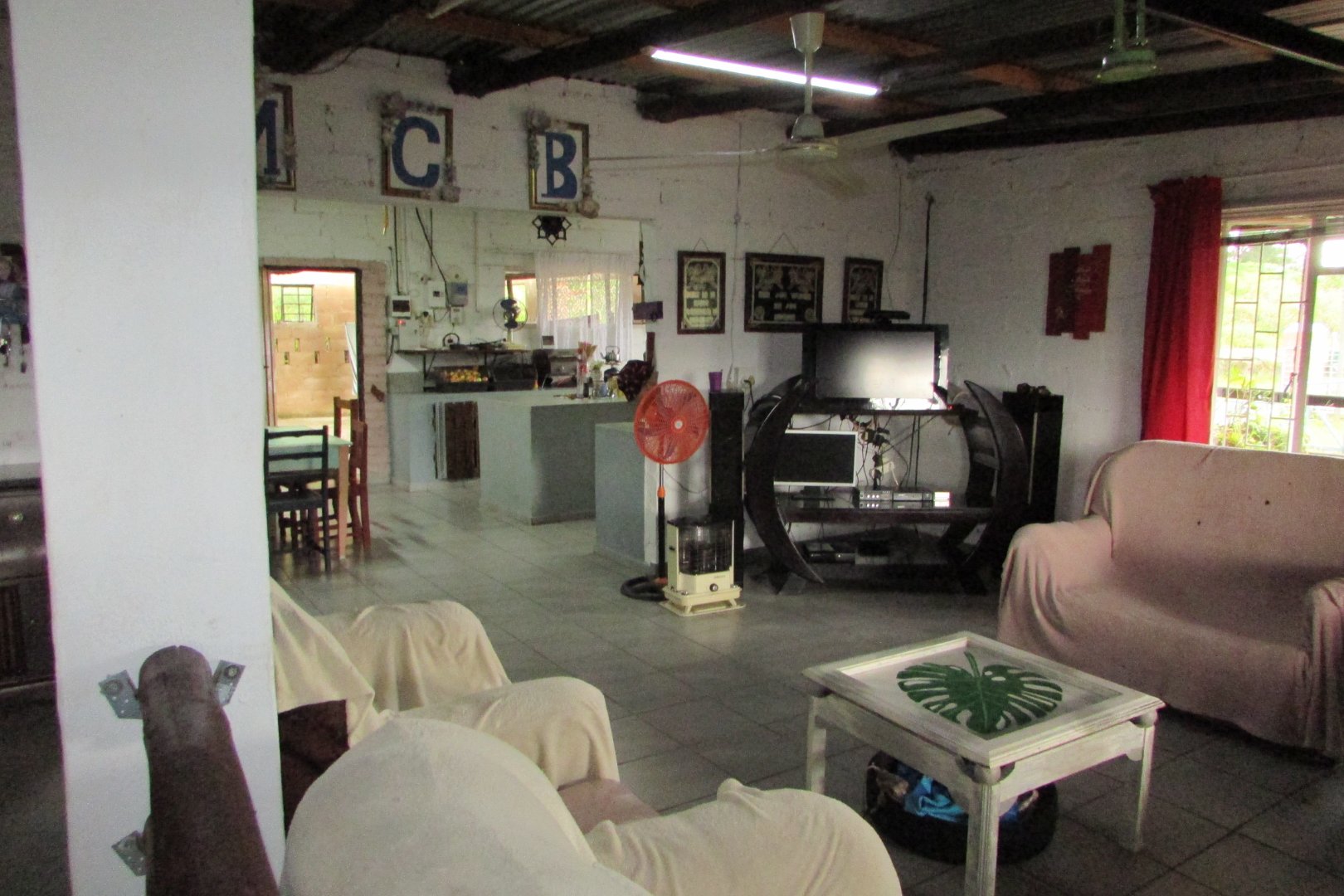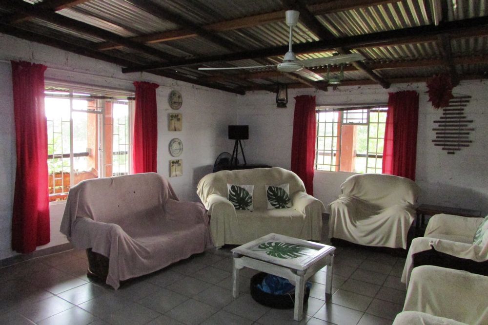 Open plan living and dining area that flows onto a wrap-around front stoep with views over the valley and the small creek bordering the property.
